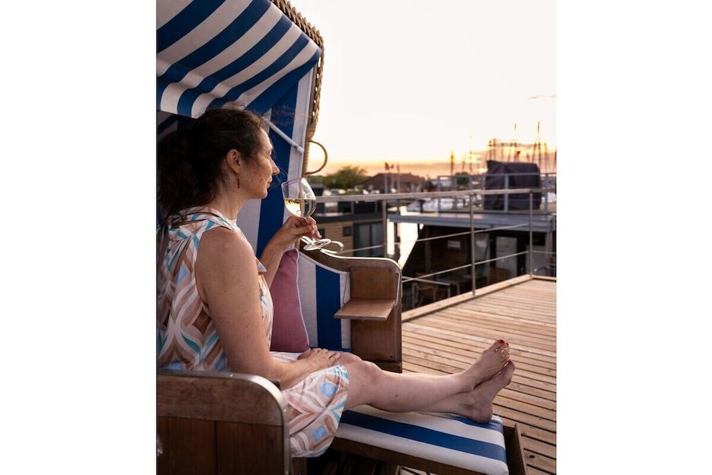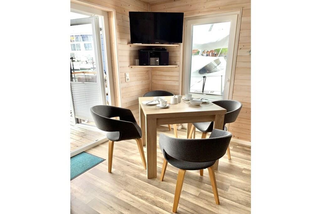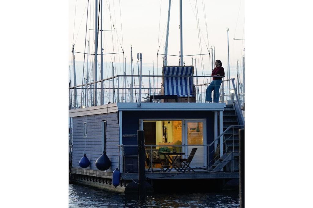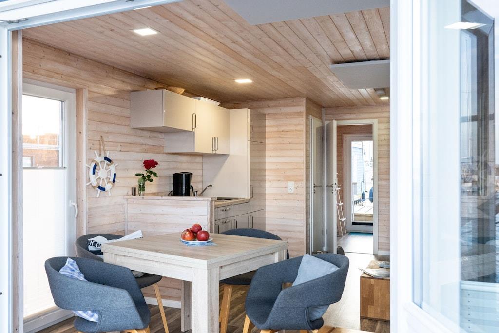 Husbåten Baltic Goose ... en ferie midt i Burgtiefe-marinaen på Fehmarn med utsikt over vannet! Husbåten Baltic Goose tilbyr omtrent 30 m² boareal fordelt på to etasjer, pluss en møblert takterrasse på 30 m² som også fungerer som soldekk, forbundet med en utvendig trapp. Den moderne og gjennomtenkt designede stuen tilbyr fantastisk panoramautsikt over marinaen og, fra soldekket, Østersjøen. Nærmere vannet kommer du ikke! Opptil 5 personer kan nyte ferien sin på denne husbåten. Stuen, med sin komfortable sofa og lille marinekomfyr, tilbyr rikelig med komfort.