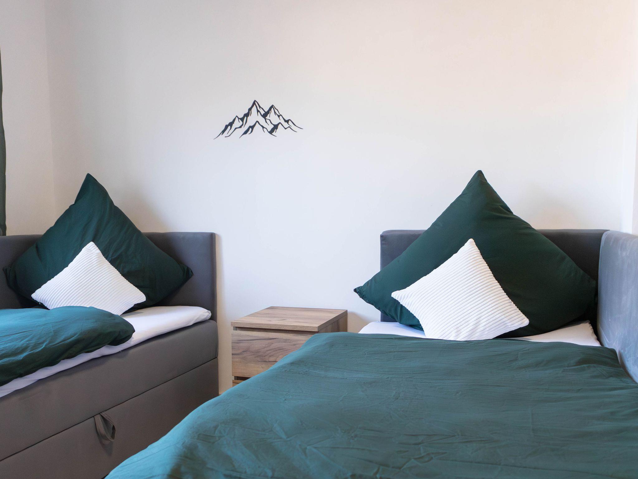 ? Zwei private Schlafzimmer mit Boxspringbetten (90 x 200 cm), flexibel als Einzel- oder Doppelbetten möglich, Smart-TV & Kleiderschrank (ab 3 Pers. ein zweites Schlafzimmer, ab 5 Pers Schlafcouch mit Bettwäsche als Schlaffunktion möglich)