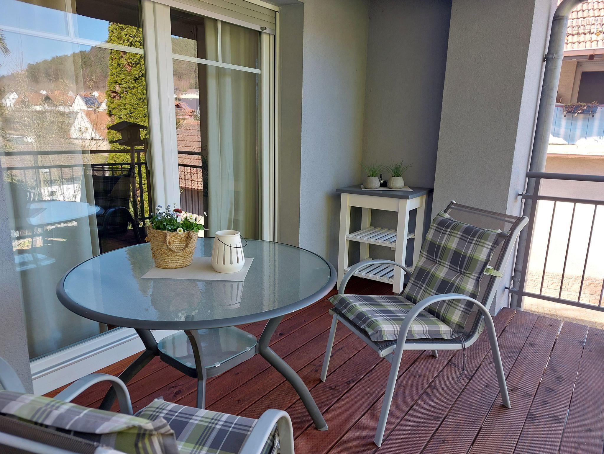 Wohnzimmer, Sofa mit Schlaffunktion, Fernseher und Balkon mit Sitzmöglichkeiten.