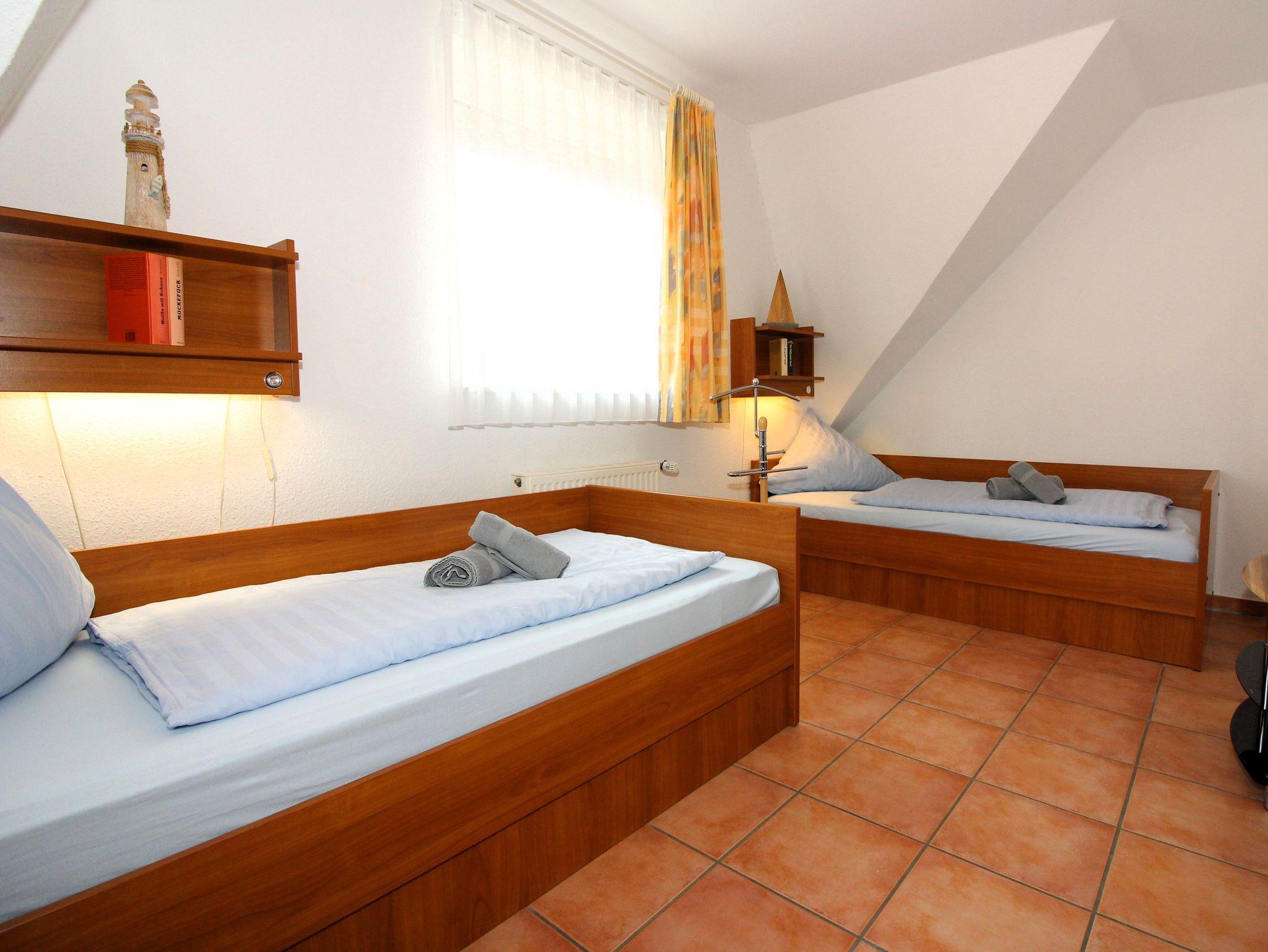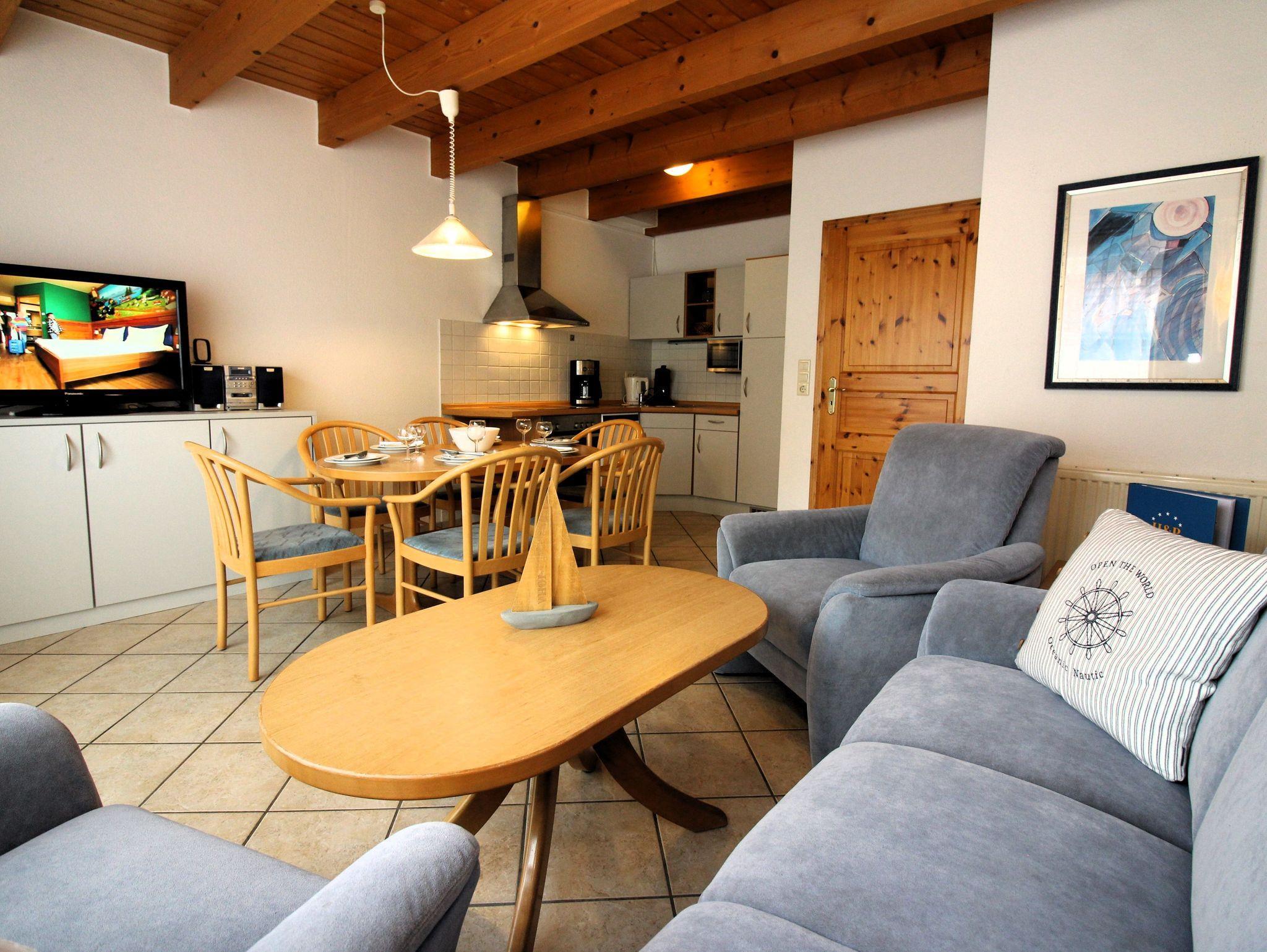 Wohnraum mit gemütlicher Sitzecke ? Sofa und zwei Sessel. Für die Unterhaltungsorgen ein HD Flachbild-TV mit (Kabel-TV) ,Radio, CD-Player, Brettspiele und eine kleine Urlaubsbibliothek. Ein Essplatz für bis zu 6 Personen wartet auf Sie und Sie kochen in der voll ausgestatteten offenen Küche: Herd mit Ceranfeld und Backofen, Spülmaschine, Kühlschrank mit Tiefkühlfach, Mikrowelle, Toaster, Kaffeemaschine, Wasserkocher, Geschirr, inkl. Kindergeschirr. Für die Terrasse mit angrenzendem kleinen Rasen stehen Ihnen acht Gartenstühle und eine Liegen mitAuflagen, Tisch, Sonnenschirm, Holzkohlegrill, Strandspiele (drei Lenkdrachen, Federball, Boule) im verschließbaren Abstellraum zur Verfügung | Ein Schlafzimmer mit zwei getrennten Betten und Kleiderschrank | Gäste WC | Garderobe und Schuhablage im Eingangsbereich | Abstellkammer mit Staubsauger, Putzutensilien und Wäschereck.