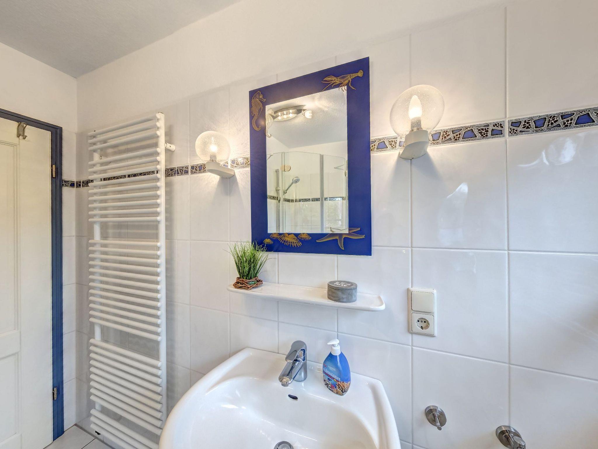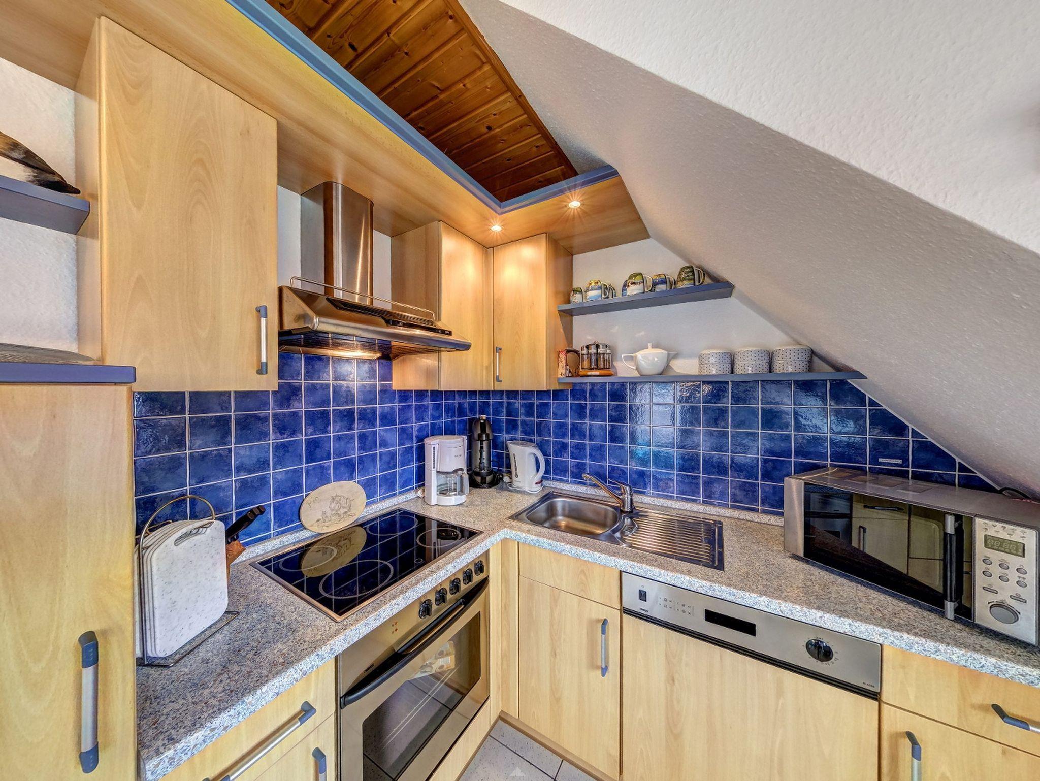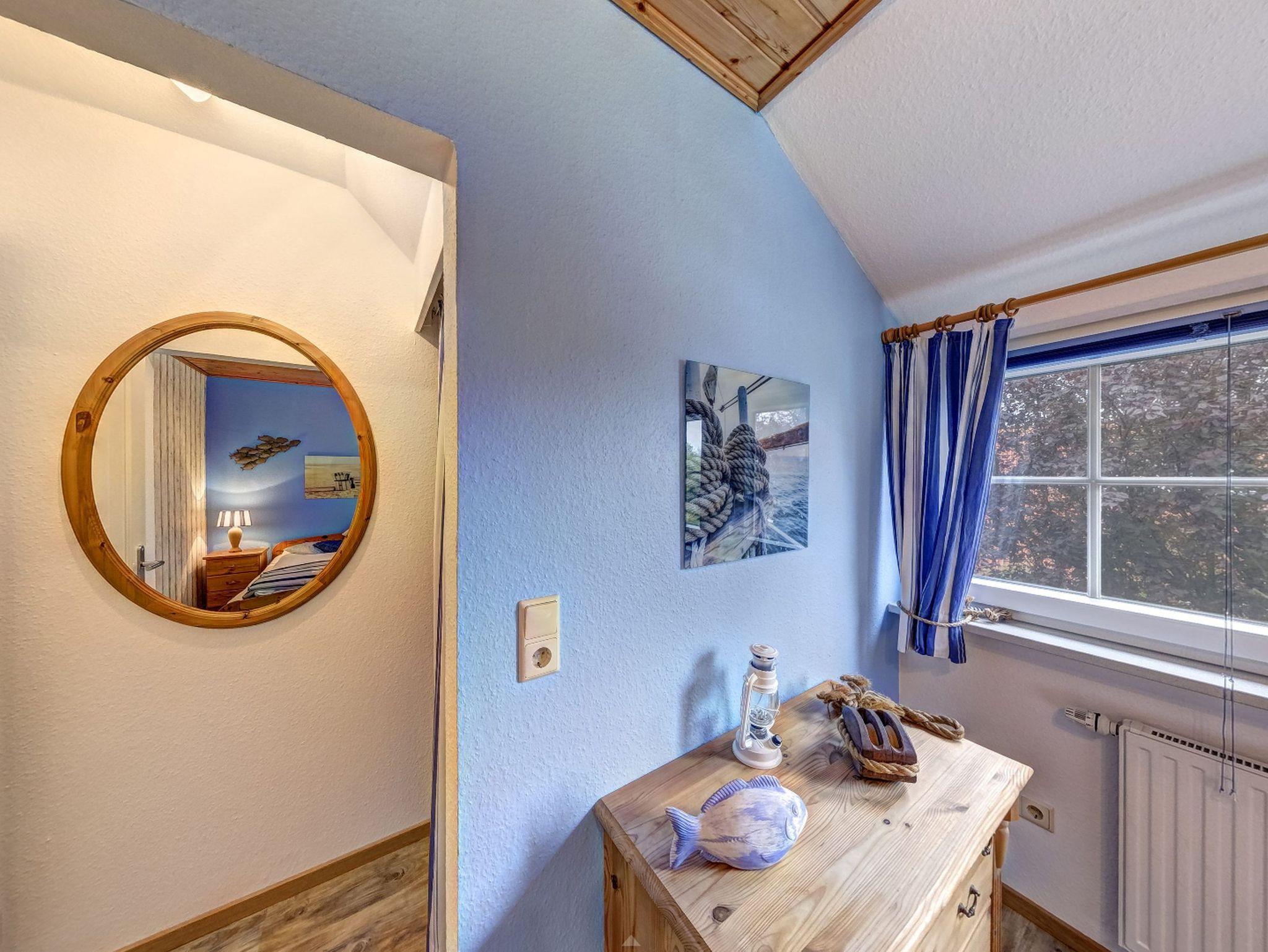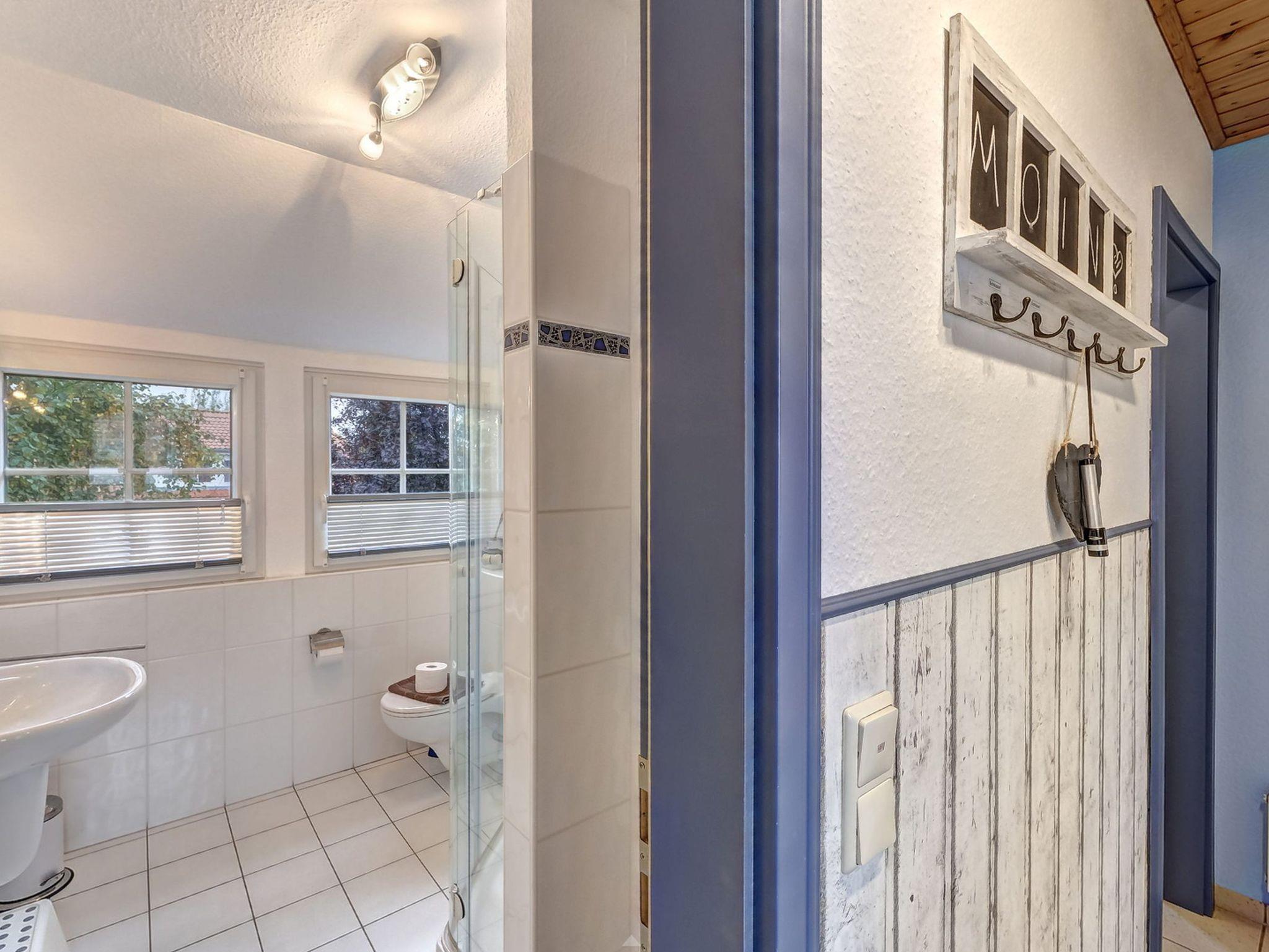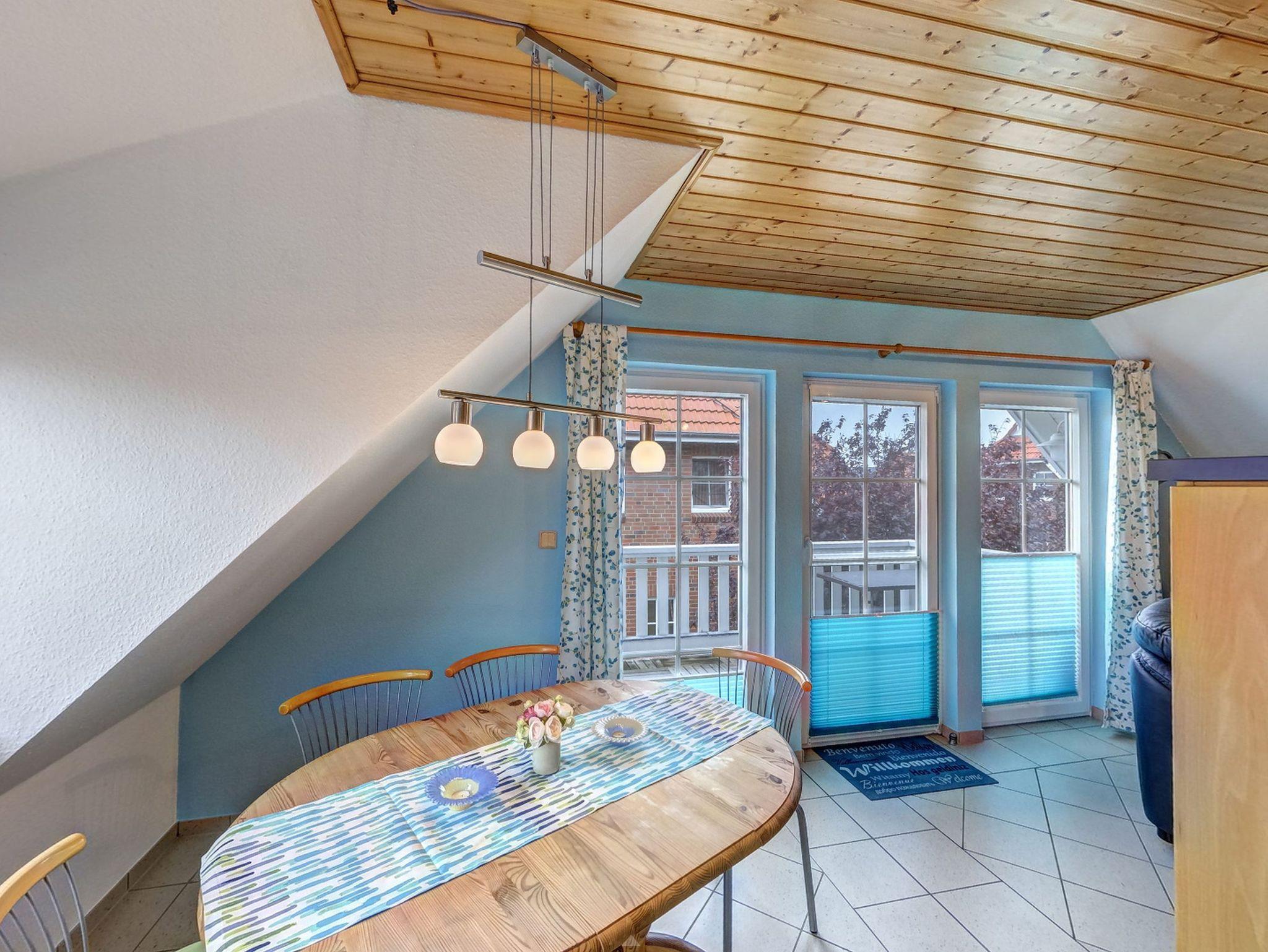 Der Eingang zur Wohnung ?Kutter? befindet sich auf der Rückseite des Hauses. Über eine Treppe gelangen Sie in das Obergeschoss, wo auf 66m² bis zu 4 Personen und ein Kleinkind ausreichend Platz finden. Zu Ihrer rechten Seite liegt das Gäste WC, sowie Schlafzimmer eins mit zwei Einzelbetten, einem Kleiderschrank und einer Kommode. Direkt gegenüber liegt Schlafzimmer zwei mit einem gemütlichen Doppelbett, einer Kommode und reichlich Stauraum für Ihre Habseligkeiten. Daneben befindet sich das große Badezimmer mit Dusche, WC, Waschbecken und Ablageflächen. Der großzügige Wohnraum erwartet Sie mit komfortablen Sofas, einem Flat-TV und einem Bücherregal. Um die Ecke befindet sich die offene, komplett ausgestattete Küche mit Esstisch. Vom Wohnraum aus können Sie auf Ihren privaten und möblierten Balkon treten, auf dem Sie entspannt zusammensitzen und die Sonne genießen können.