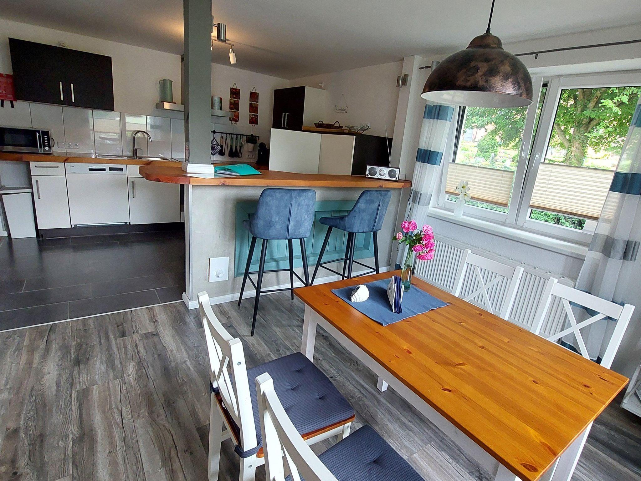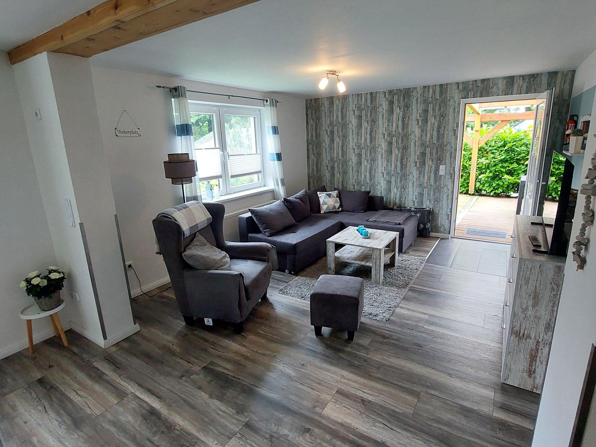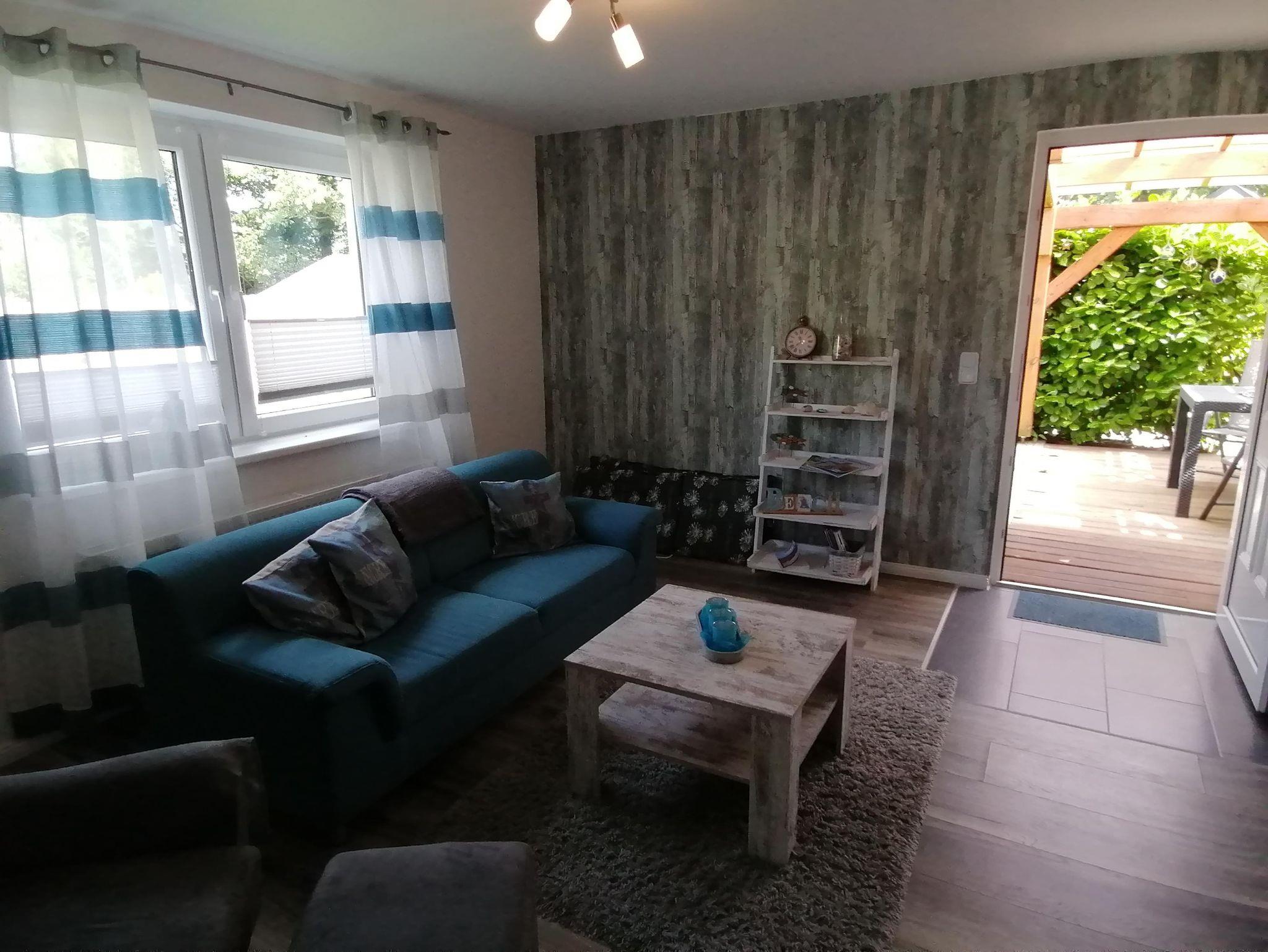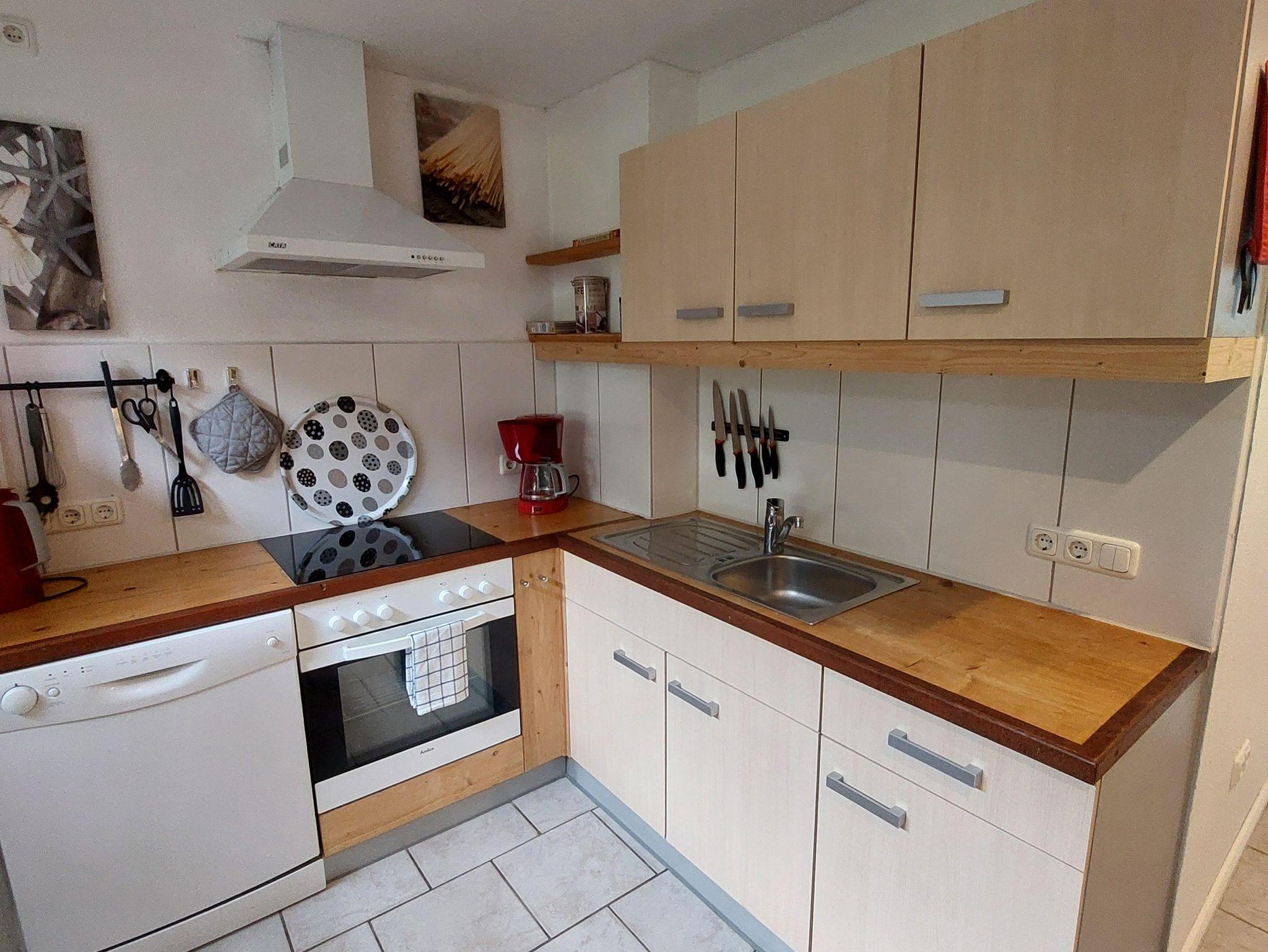 Diese sehr großzügig geschnittene Erdgeschoss-Wohnung bietet Platz für 2 Personen und einem Kleinkind bis zwei Jahre. Durch die Eingangstür betreten Sie den Wohnraum, ausgestattet mit einer sehr gemütlichen Wohnecke mit TV und HiFi-Anlage. Eine Essecke ist vorhanden. Die vollausgestattete Küchenzeile ist mit: Ceranfeld, Mikrowelle, Geschirrspüler, Backofen, Kaffee- und Kaffeepadmaschine, Wasserkocher, Toaster und weiteres mehr bestückt . Vom Flur aus kommen Sie in das Schlafzimmer mit einem Doppelbett und einem Kleiderschrank und in das Bad mit einer flachen Dusche, Waschtisch, WC und Fön. Eine überdachte Terrasse mit Terrassenmöbeln lädt zu schönen Abenden ein.