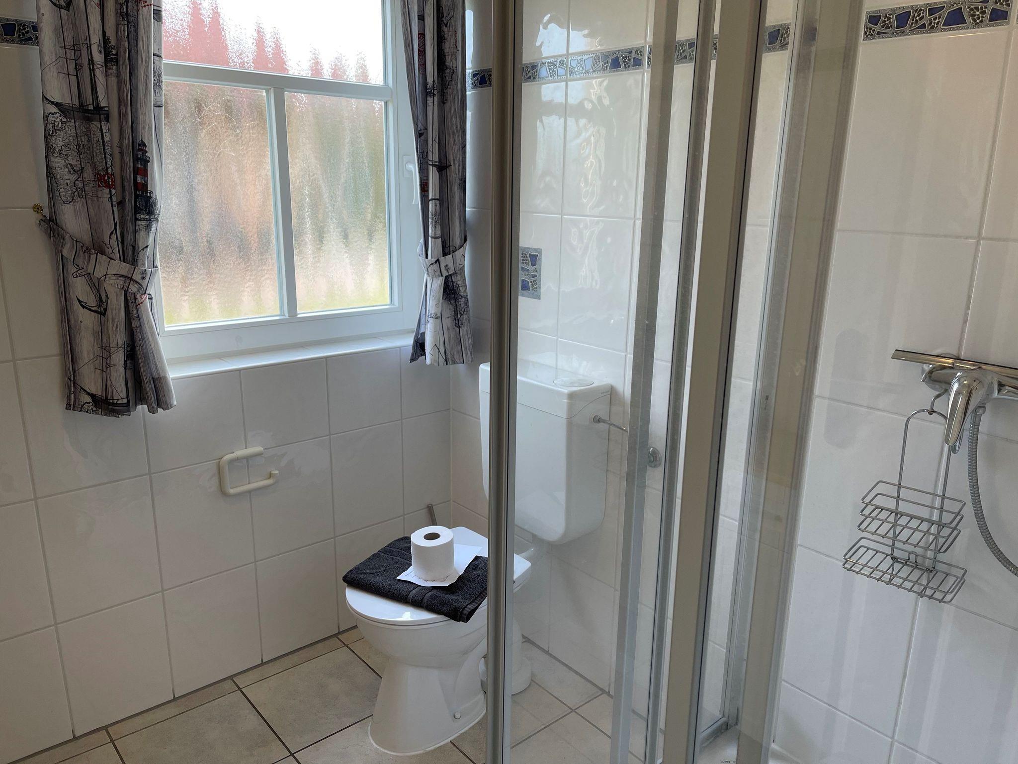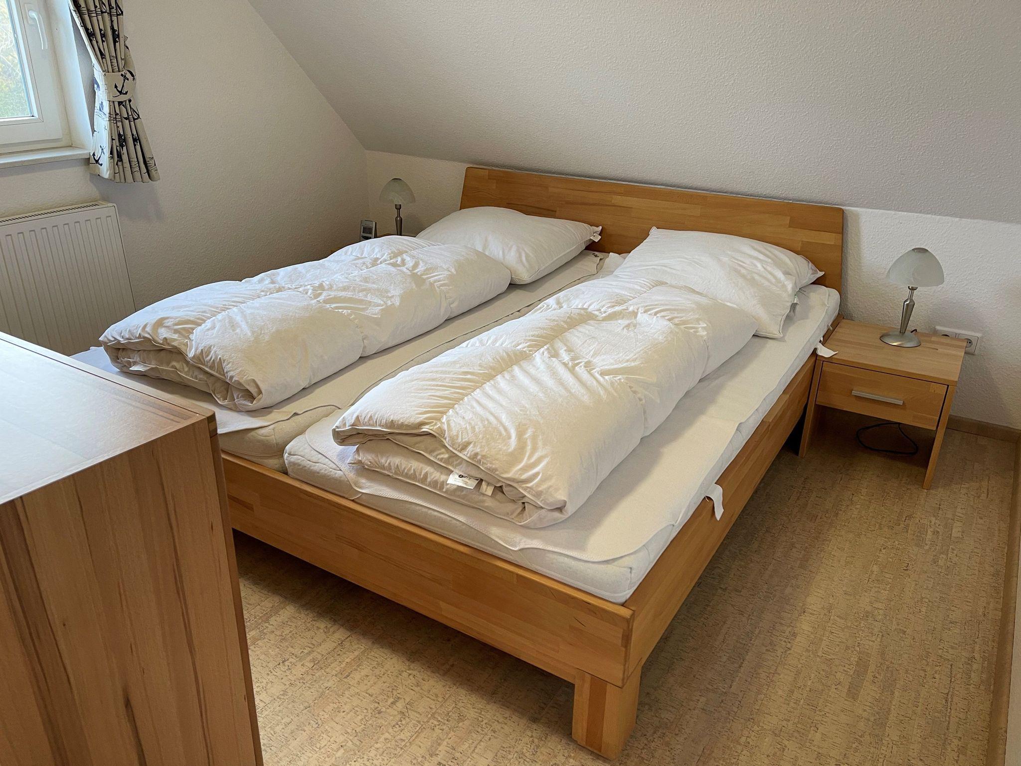 Das Obergeschoss der Doppelhaushälfte erreichen Sie über eine Holztreppe. Hier befindet sich ein Schlafzimmer mit Doppelbett und ein weiteres Schlafzimmer mit einem oder zwei Einzelbetten. Ein zweites Badezimmer mit Dusche und WC finden sie ebenfalls hier.