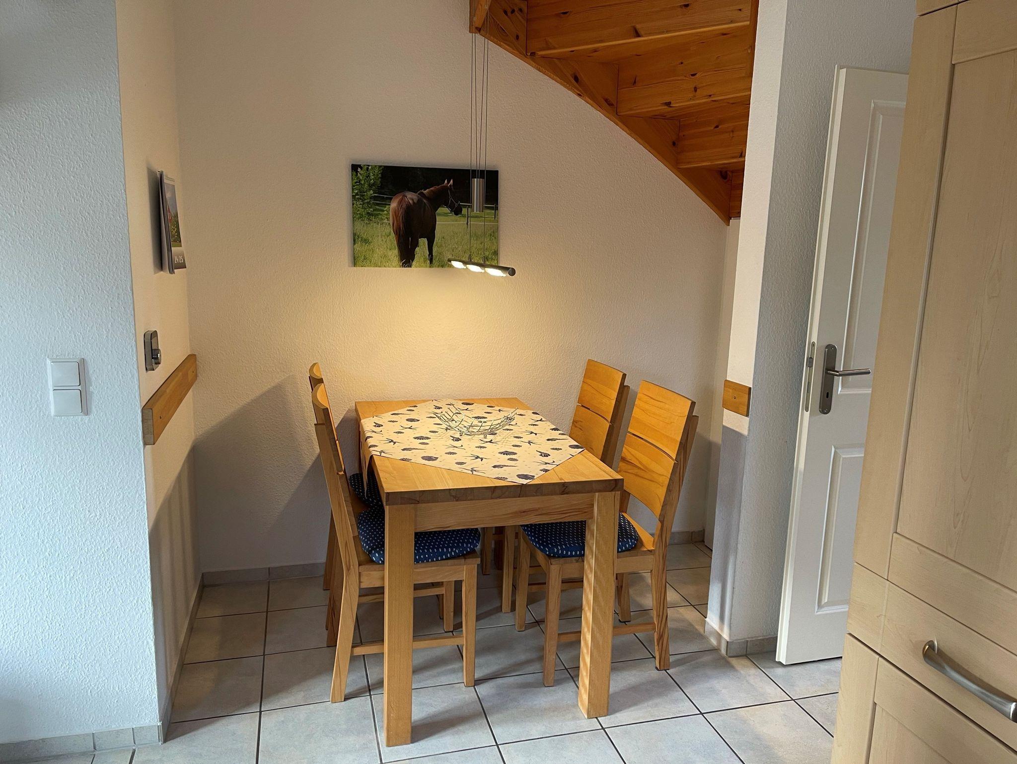 Im Erdgeschoss finden Sie einen hellen Wohnraum mit angeschlossener Küche und Esstisch sowie ein Bad mit Dusche und WC.