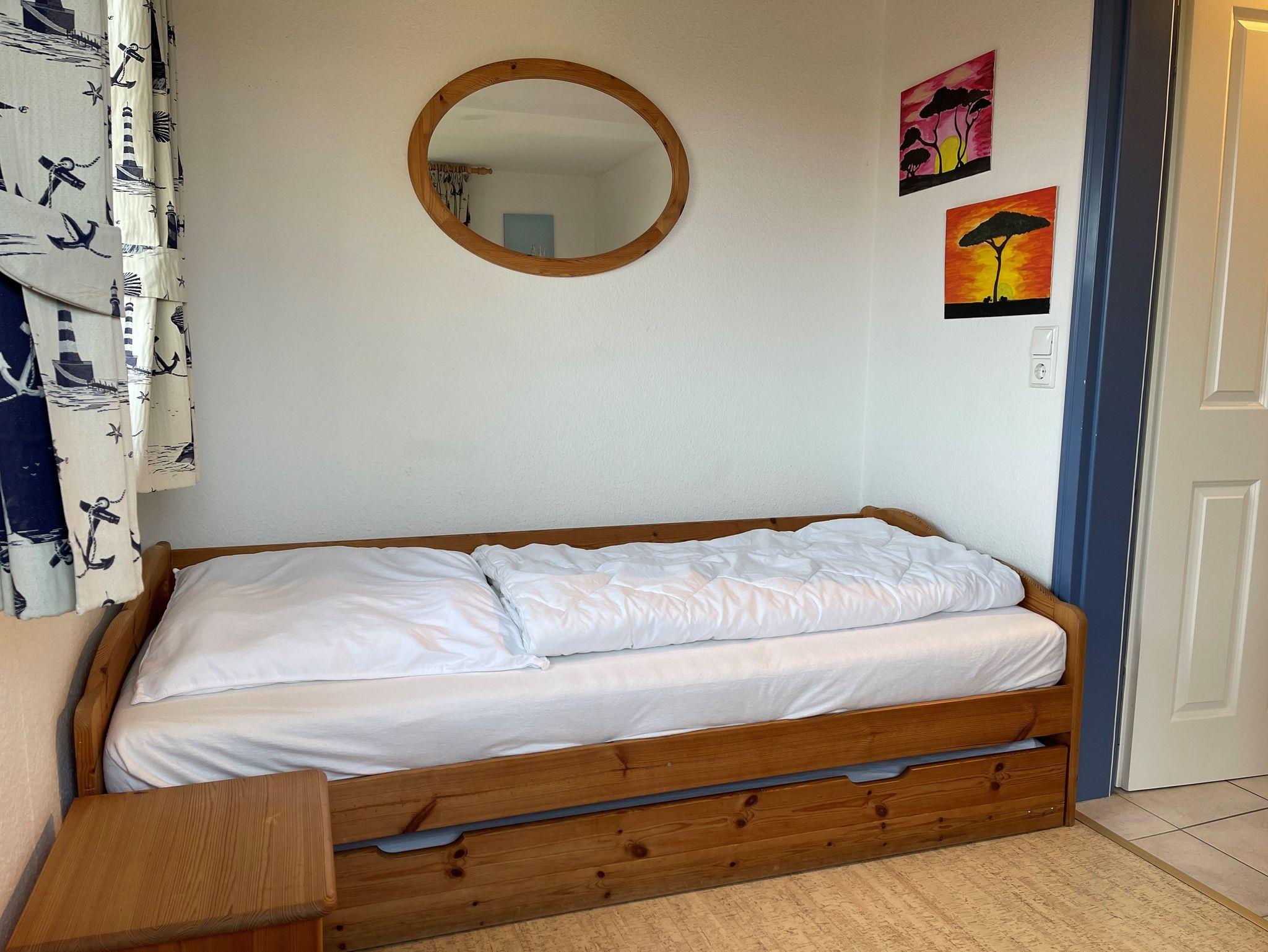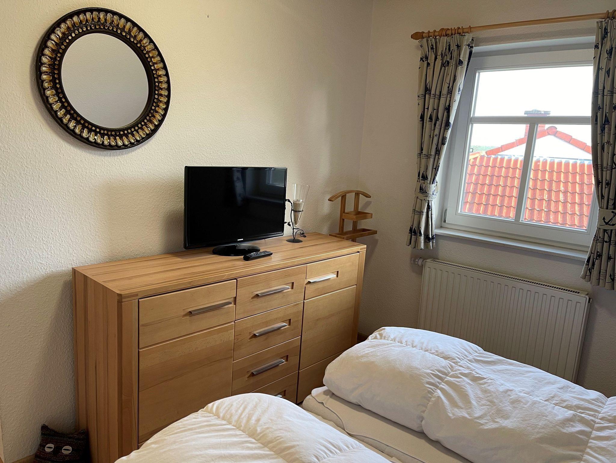 Die Schlafräume (einmal mit Doppelbett und Fernseher, einmal mit ausziehbaren Einzelbett ausgestattet) sowie ein weiteres Bad mit Badewanne und WC befinden sich im Obergeschoss.