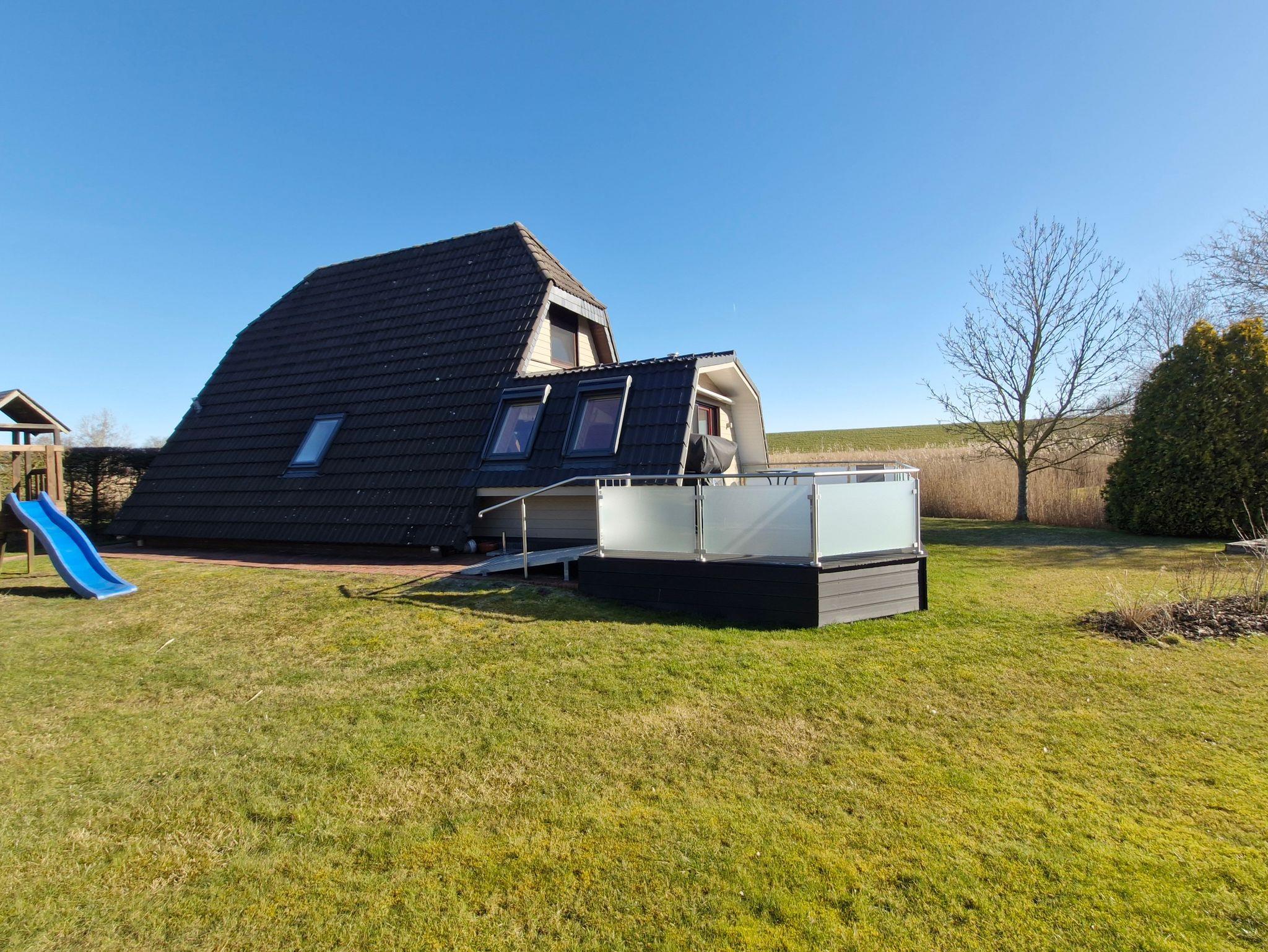 Große Sonnenterrasse mit Blick auf den Deich, Abstellraum und Parkplatz am Haus.