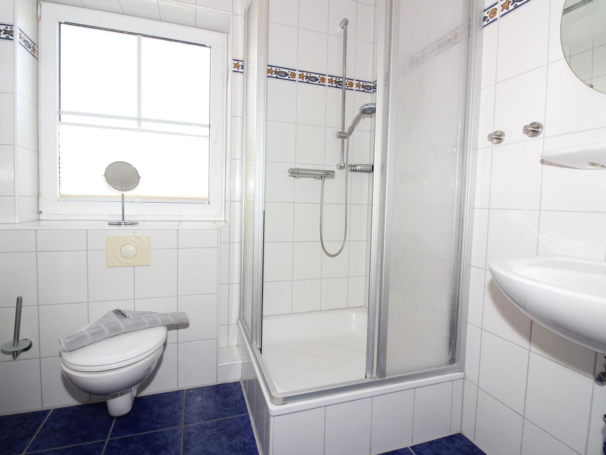 Im Obergeschoss befindet sich das Duschbad mit WC, ein Schlafzimmer mit Doppelbett inkl. LCD TV mit DVD