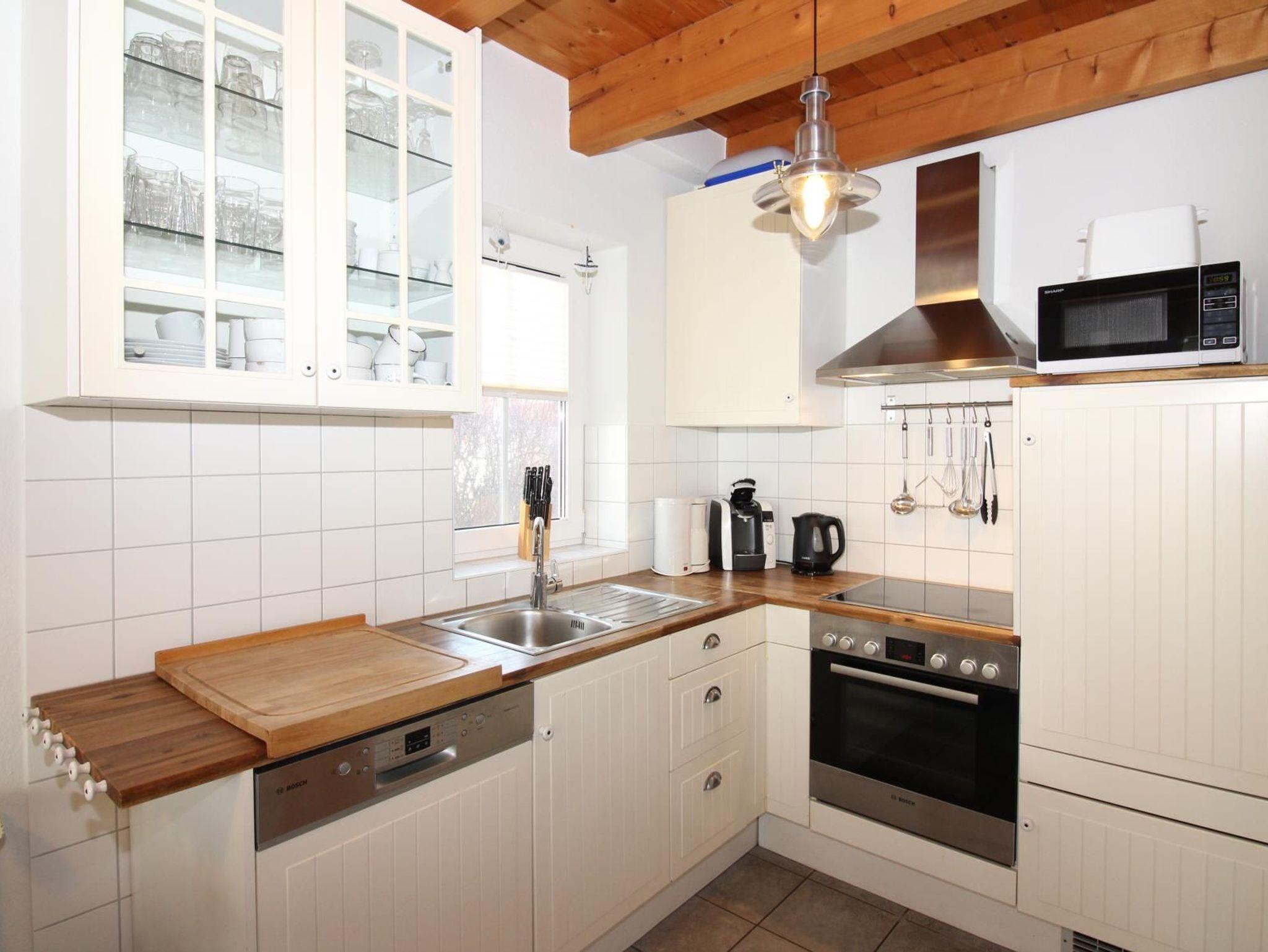 Wohnküche mit Geschirrspüler und Mikrowelle schließt sich an den Wohnraum an. Ein gemütlicher Essplatz,