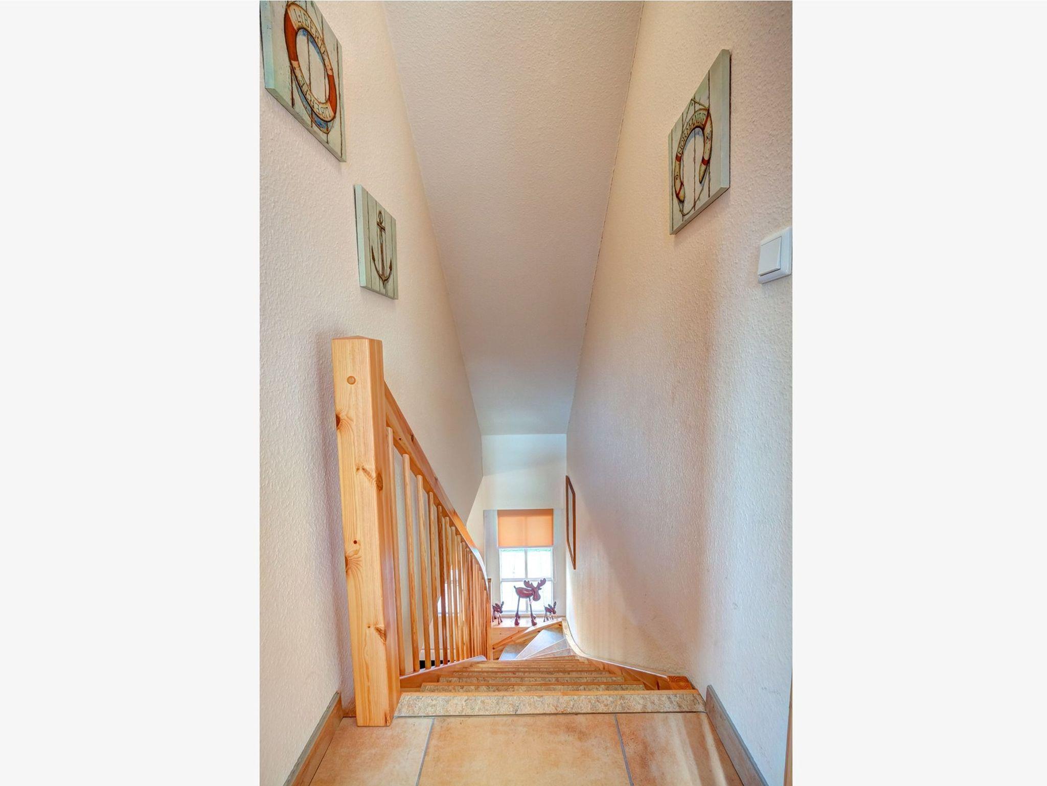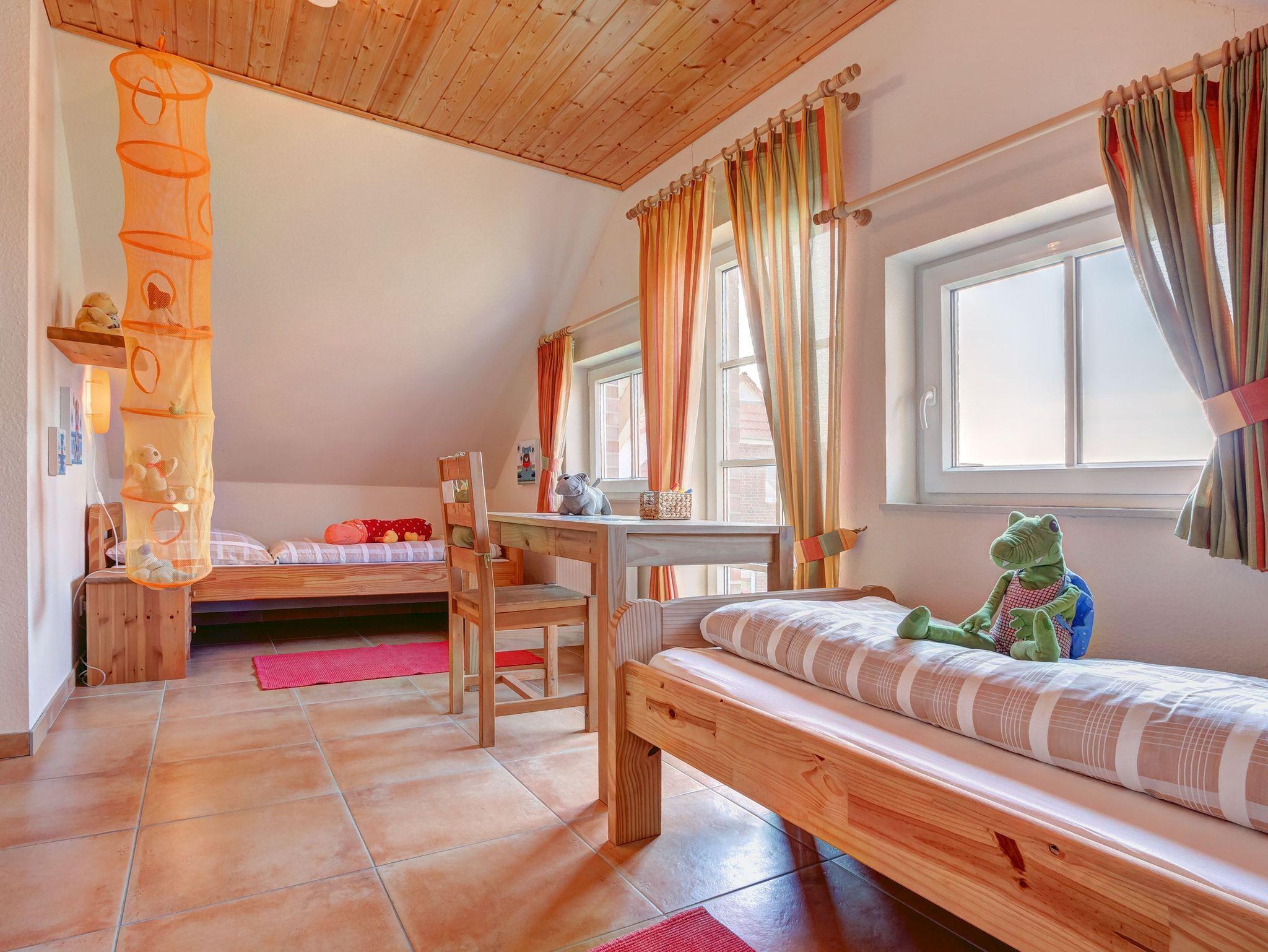 Über die Holztreppe im Flur gelnagen Sie in das Obergeschoss des Hauses.Hier befinden sich zwei weitere Schlafzimmer: ein Kinderzimmer mit zwei Einzelbetten und einem kleinen Schreibtisch, sowie ein Schlafzimmer mit Doppelbett und einer Kommode.