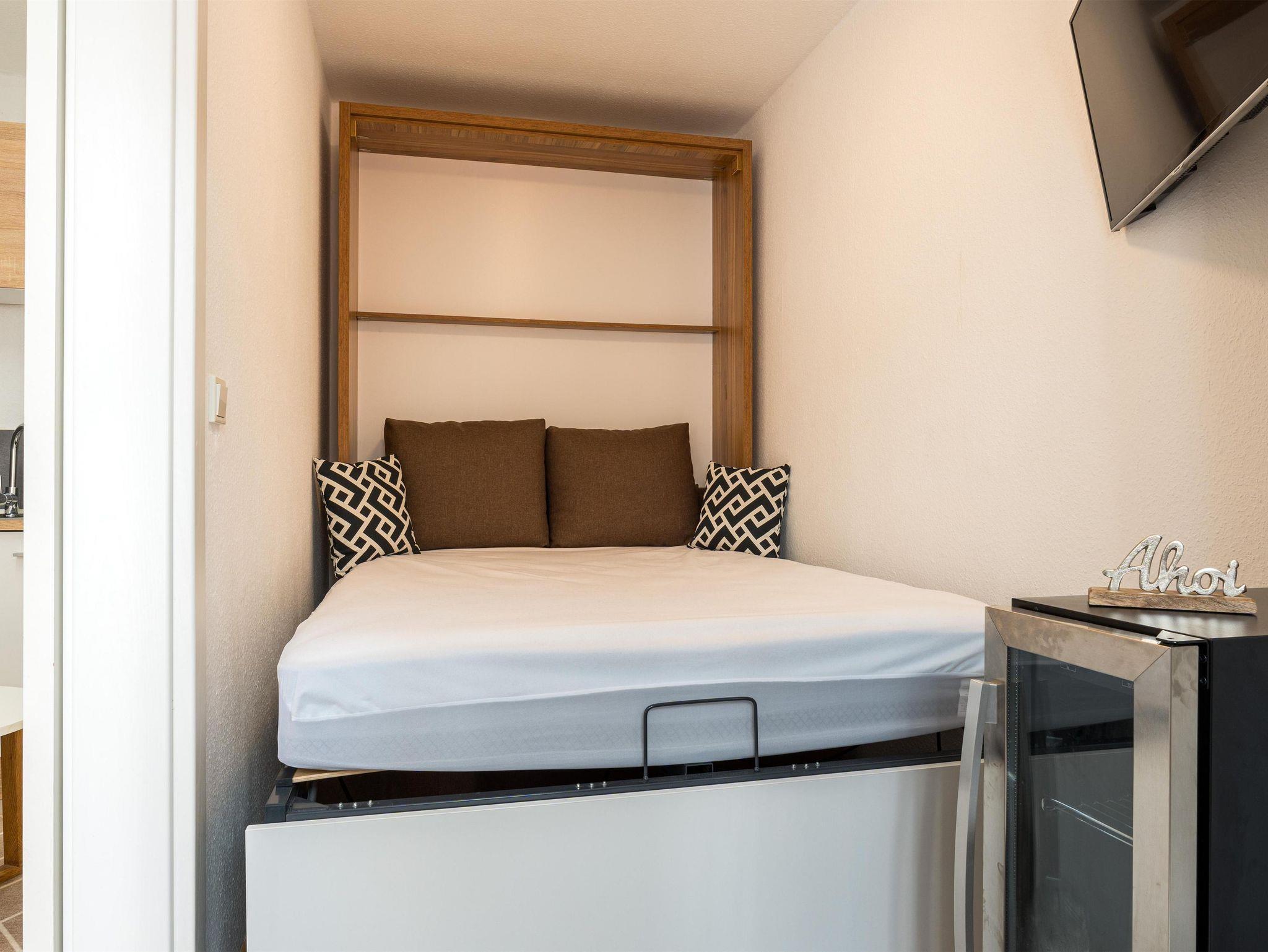Diese kompakte, aber clever gestaltete Wohnung nutzt jeden Quadratmeter optimal aus. Der Wohn- und Schlafbereich ist mit einem Schrankbett ausgestattet, das bei Bedarf einfach verstaut werden kann, um den Raum flexibel zu nutzen. Ein TV im Schlafzimmer sorgt für gemütliche Unterhaltung. Das moderne Badezimmer verfügt über eine ebenerdige Dusche und ein WC. Der Essbereich mit ausklappbarem Tisch schafft bei Bedarf mehr Platz, während die kleine Küchenzeile alles bietet, was Sie zur Zubereitung Ihrer Mahlzeiten benötigen.