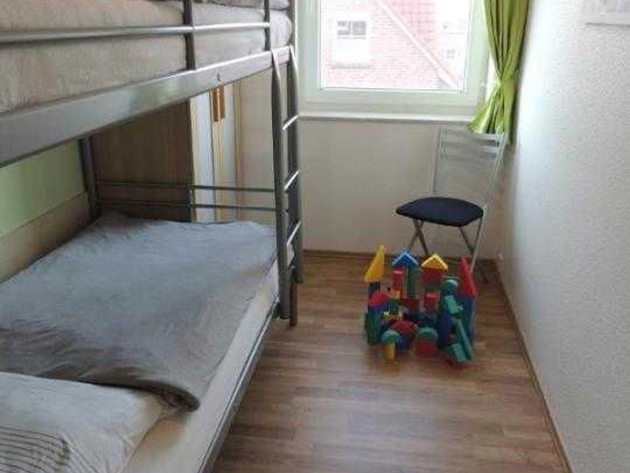 Die Wohnung verfügt über einen Schlafraum mit Doppelbett, ein Kinderzimmer mit Etagenbett, einen