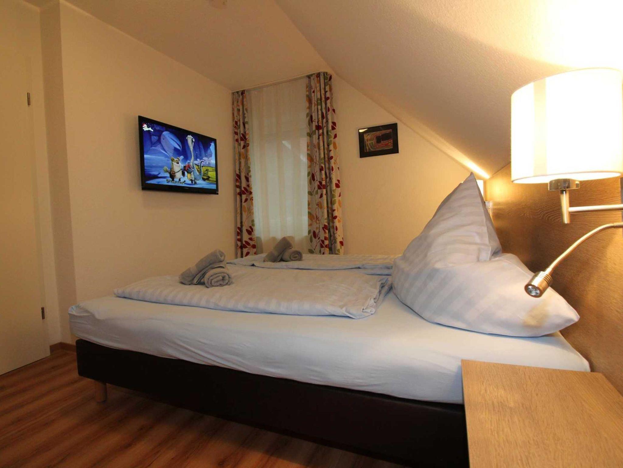 ein Schlafraum mit zwei Einzelbetten (und Kabel-LED-Fernseher)