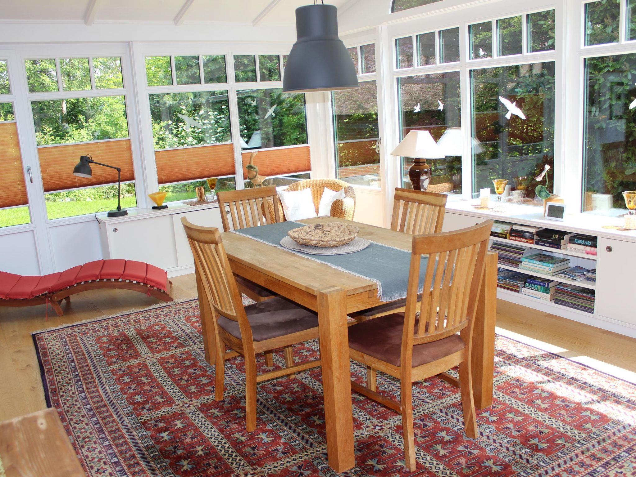 Die 80m² große Nichraucherwohnung Wintergarten befindet sich im Erdgeschoss und bietet Platz für max. 4 Personen plus Baby. Sie verfügt über ein Wohn-/Esszimmer mit Sat-TV, Radio und Sessel. Die offene Küche ist mit Ceranfeld, Backofen, Mikrowelle, Kühlschrank, Wasserkocher, Toaster, Eierkocher und Toaster ausgestattet. Zudem verfügt die Wohnung über einen großen Wintergarten mit Esstisch, 4 Stühlen, Kinderstuhl sowie einer Ralaxliege und einer gemütlichen Leseecke. Vom Wintergarten aus gelangt man direkt auf die Terrasse. Die 2 Schlafzimmer sind mit Doppelbetten und Kleiderschrank ausgestattet, in einem der Schlafzimmer ist zudem ein weiterer Fernseher vorhanden. Das Bad ist mit WC, Dusche Waschbecken und Fön ausgestattet.