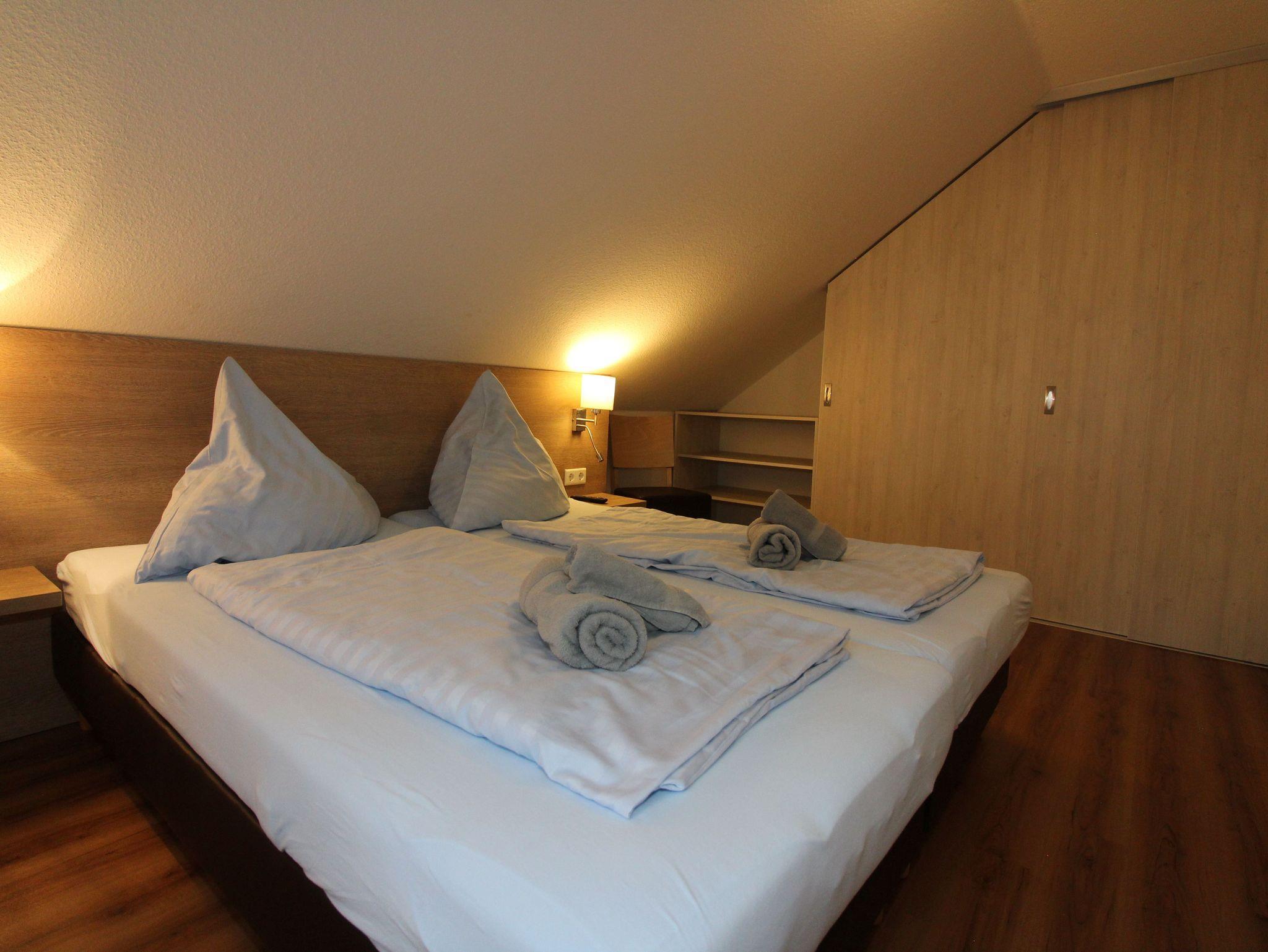 ein Schlafzimmer mit Doppelbett, Flachbild TV, Schrankwand, Leseleuchten, Radiowecker und Sessel,