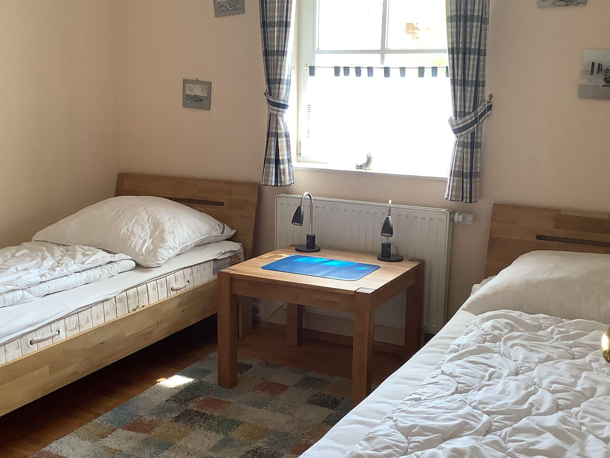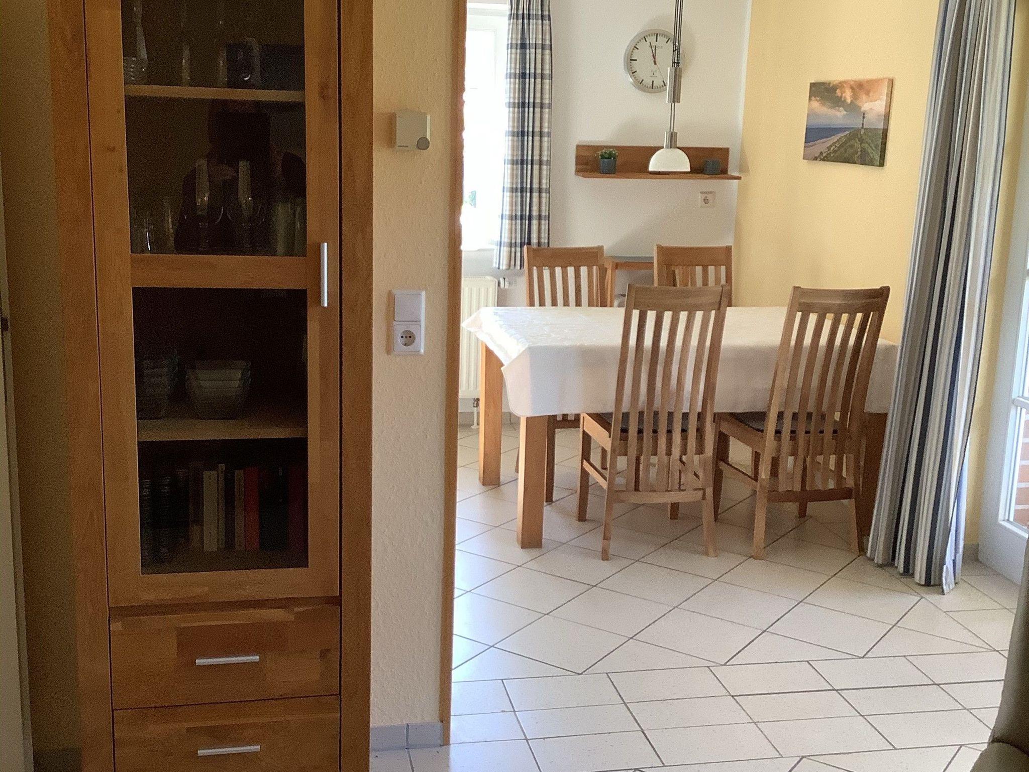 Die Ferienwohnung Ketsch biete auf 65m² ausreichend Platz für 4 Personen plus Kleinkind und befindet sich im Erdgeschoss des Hauses. Der großzügige Wohnraum empfängt Sie mit einer offenen, komplett ausgestatteten Küche sowie einem Esstisch und gemütlichen Sitzmöbeln. Von hier gelangen Sie auf die möblierte Terrasse, auf der Sie zu jeder Zeit zusammensitzen und entspannen können. Im ersten Schlafzimmer befindet sich ein bequemes Doppelbett, sowie ein Kleiderschrank, in dem Sie Ihre Habseligkeiten verstauen können. Das Schlafzimmer zwei verfügt über zwei Einzelbetten und einem kleinen Schreibtisch in der Mitte.