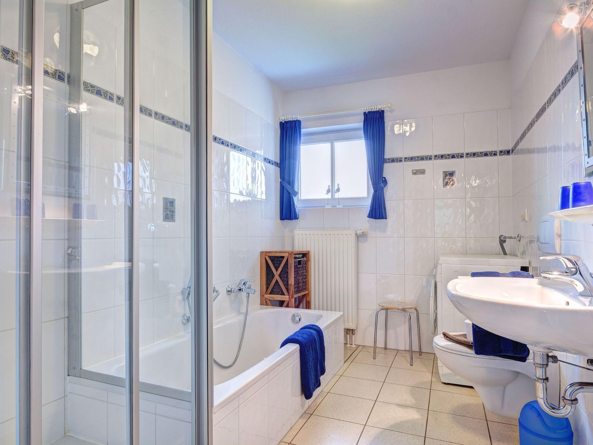 Damit früh niemand anstehen muss, gibt es in der Ferienwohnung ein großes Badezimmer mit Dusche, Badewanne, Waschmaschine, WC, Waschbecken und genügend Abstellfläche, sowie einem Gäste-WC.
