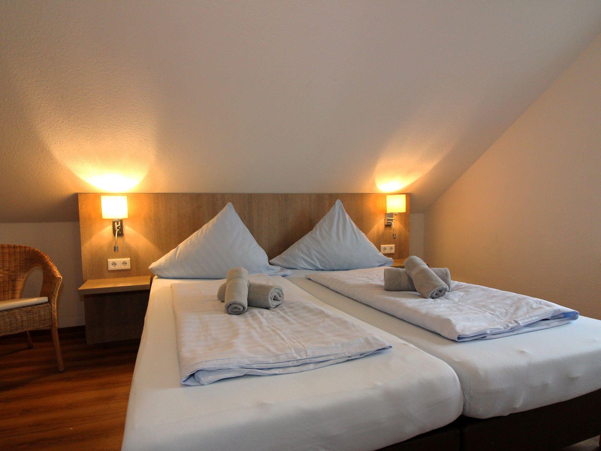 ein Schlafzimmer mit zwei getrennten Boxspring-Betten, 32“-LED-Fernseher, Radio-USB-CD-Player