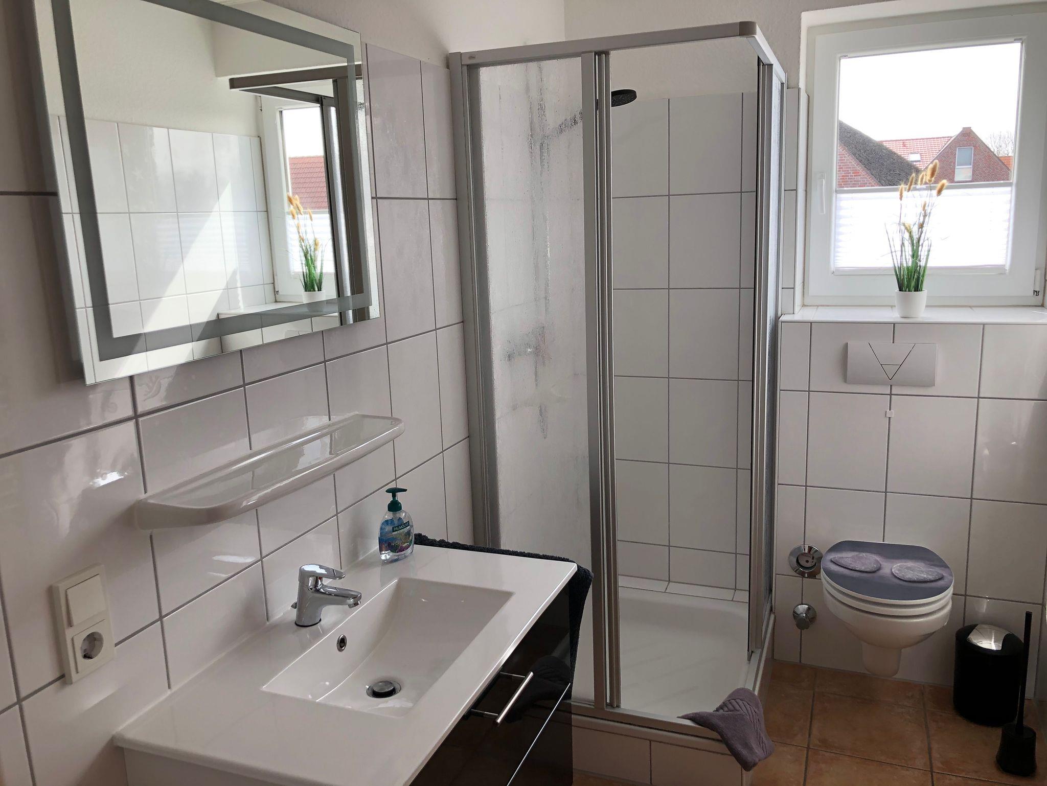 Badezimmer: Fenster, moderner Waschtisch, Dusche, WC, Handtuchheizkörper, Schrank, Föhn.