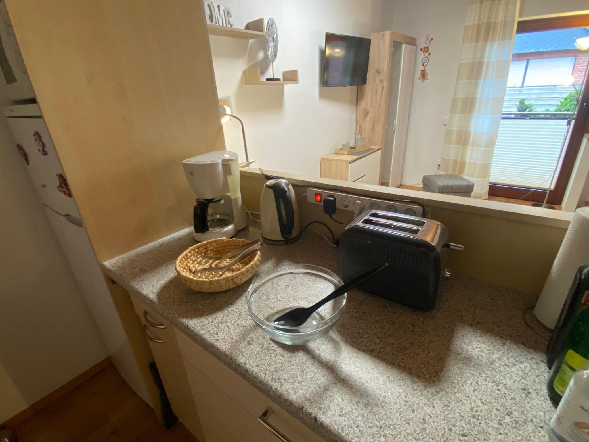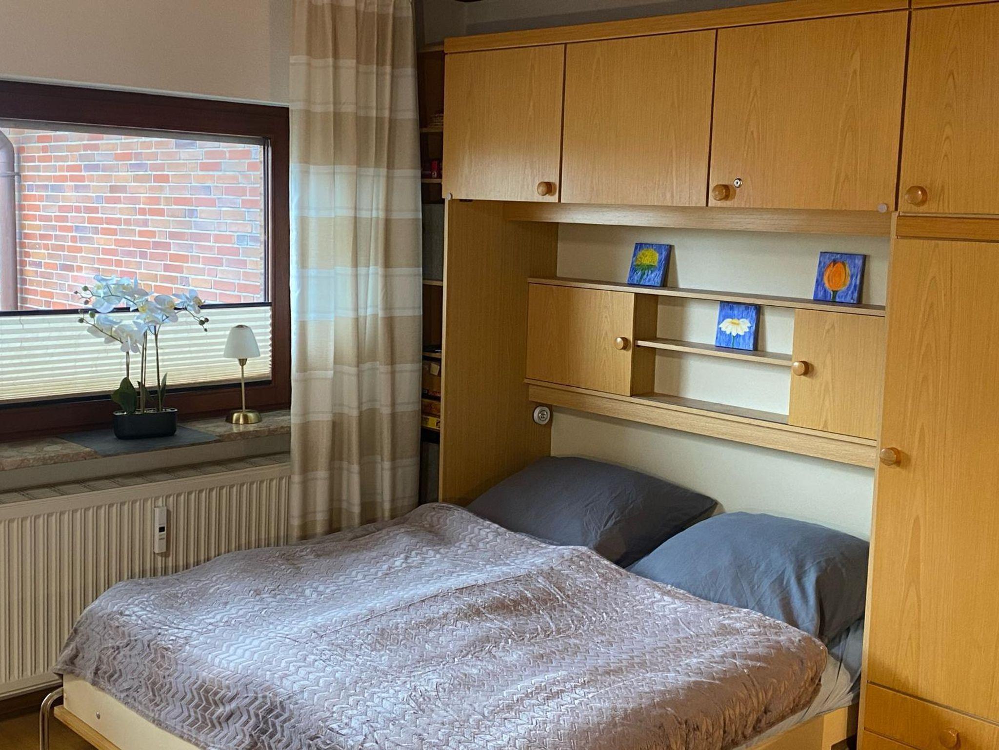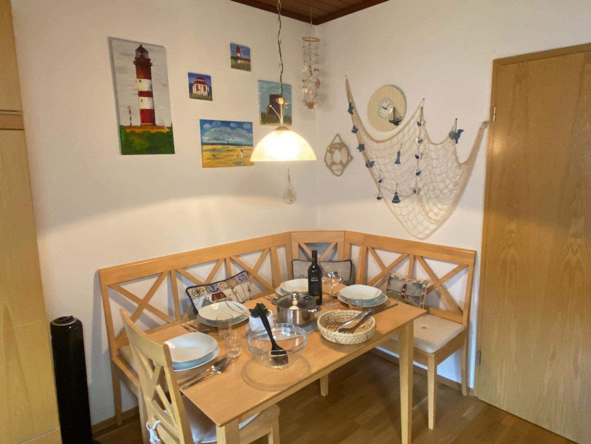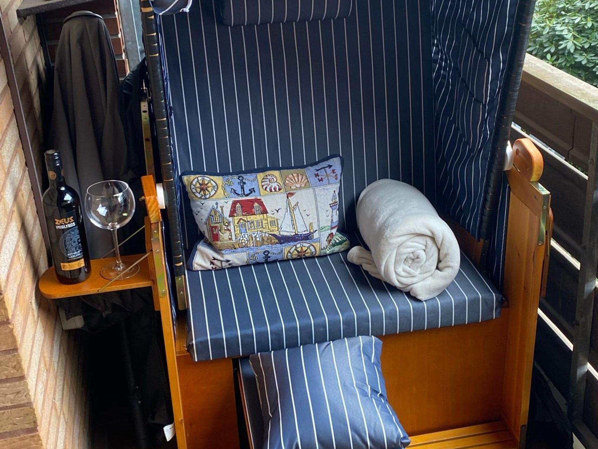 Die Ferienwohnung liegt im 1. OG des Gästehauses Erika und bietet Platz für max. 4 Personen. Die Betten verteilen sich auf 2 Räume. Es gibt ein kleines Schlafzimmer mit Etagenbetten und im Wohn-Essbereich steht ein bequemes Schrankbett (Doppelbett) zur Verfügung. Alle chlafbereiche können durch Rolläden vollständig verdunkelt werden. Zentrum der Wohnung ist der offene Wohn-/Ess-/Küchenbereich in dem sich wunderschöne Urlaubstage verbringen lassen. Bei dem schönen Wetter lädt der Balkon zum Entspannen ein. Der hier bereitstehende Strandkorb nietet maritimes Flair.