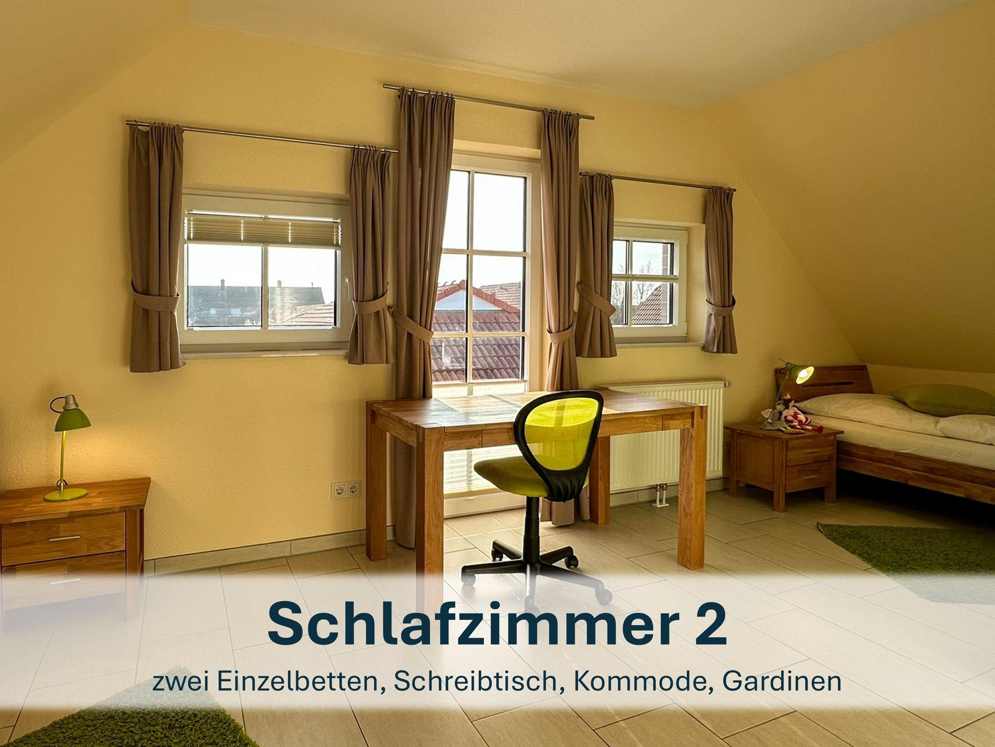Über die Holztreppe im Flur gelnagen Sie in das Obergeschoss des Hauses.Hier befinden sich zwei weitere Schlafzimmer: ein Kinderzimmer mit zwei Einzelbetten und einem kleinen Schreibtisch, sowie ein Schlafzimmer mit Doppelbett und einer Kommode.