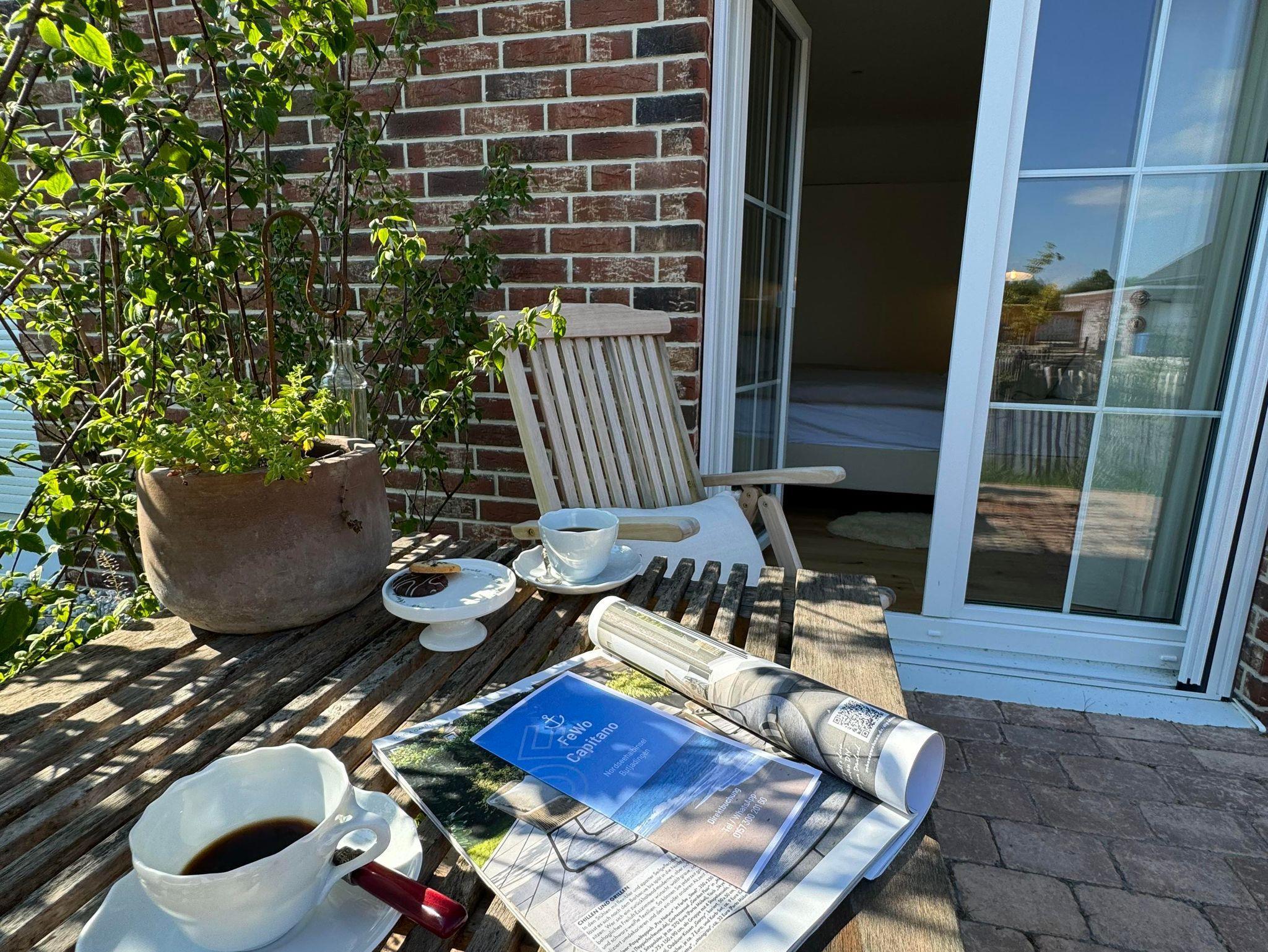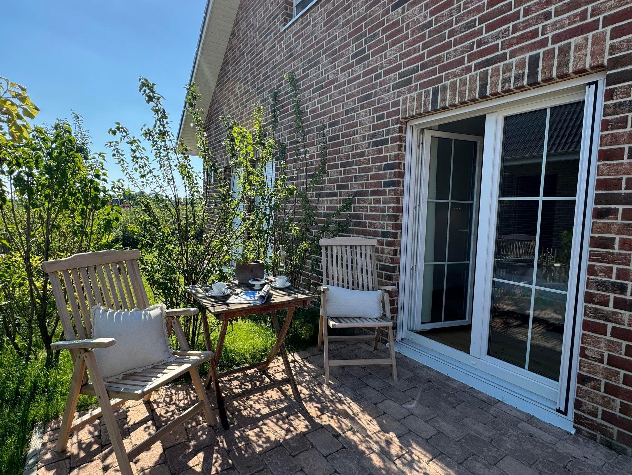 eingefriedete Terrasse mit Holz-Tisch und Holz-Stühlen