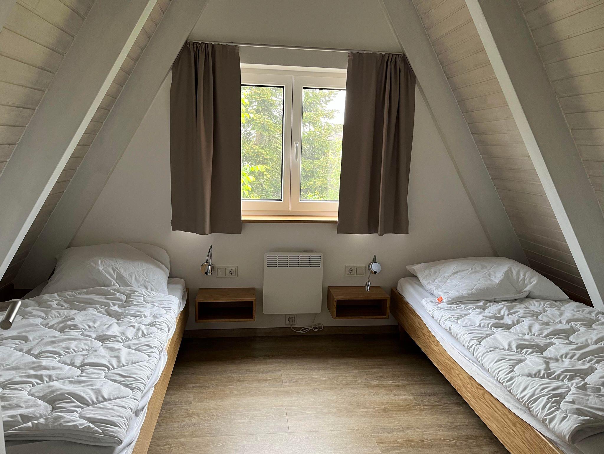 Im OG befinden sich 2 Schlafzimmer. Das Elternschlafzimmer ist mit einem Doppelbett, einem Kleiderschrank, sowie einem Flachbildfernseher ausgestattet. Hier kann zusätzlich das vorhandene Klappbett und ein Baby-Reisebett aufgestellt werden. Im zweiten Schlafzimmer sind zwei Einzelbetten. Die Fenster im OG sind mit Gardinen zum Abdunkeln und Insektenschutz versehen. An der Treppe ist ein Treppenschutzgitter angebracht.