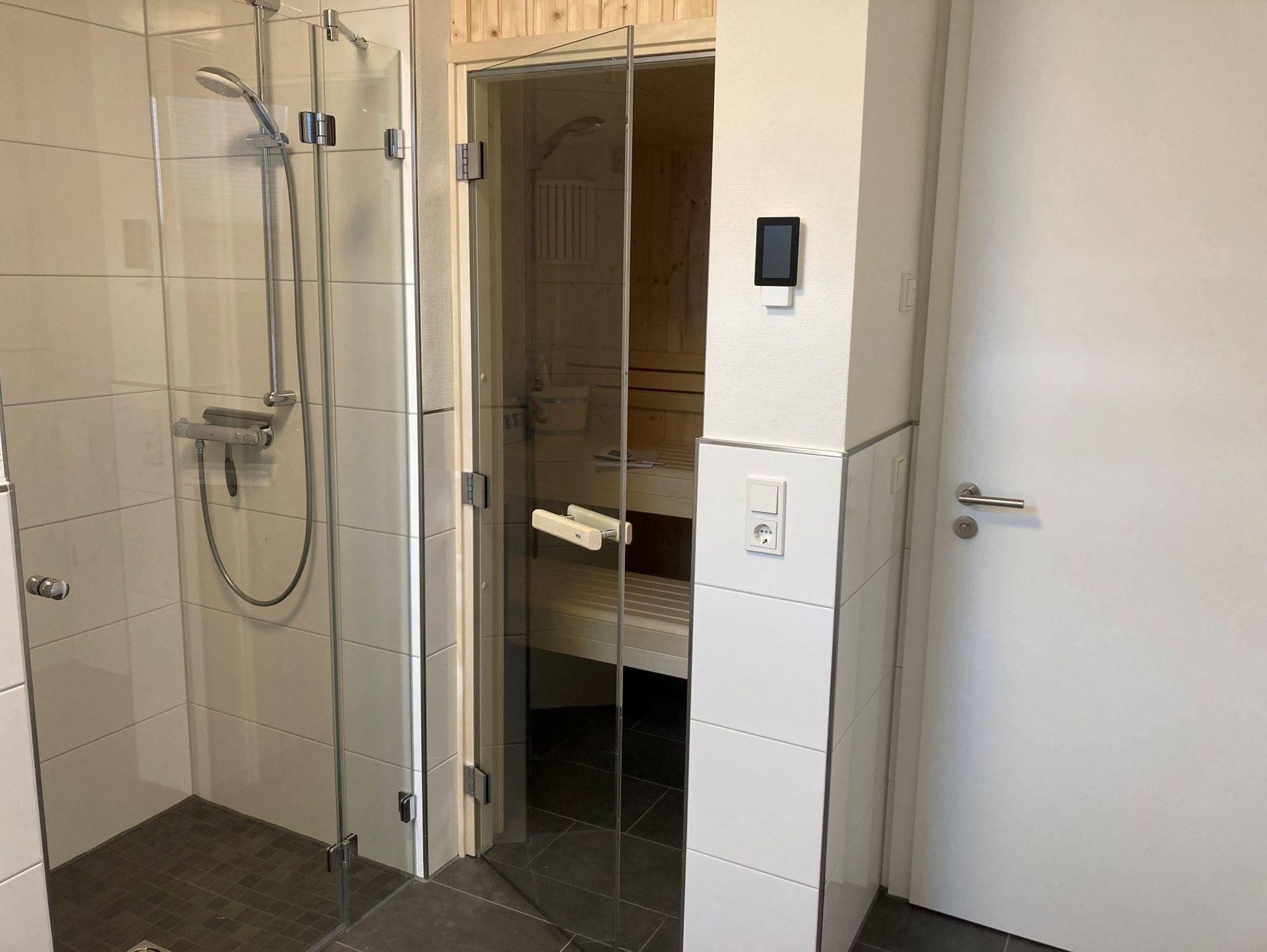2 getrennte Bäder, eines davon im Erdgeschoss, bieten maximalen Komfort durch bodengleiche Duschen. Das Bad im Obergeschoss wird ergänzt durch eine Sauna, welche gerade bei schlechtem Wetter für perfekte Urlaubsstimmung sorgt. Eine Waschmaschine und eine Spülmaschine gehören ebenfalls zur Ausstattung des Hauses.