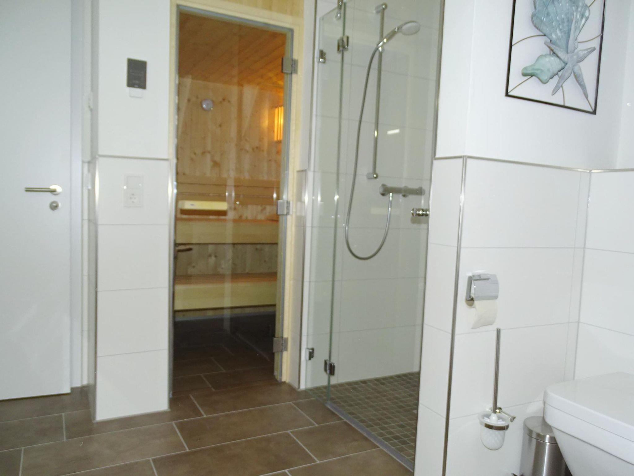 Duschbad/WC/Sauna Zeit nehmen und Wohlfühlen. Ausstattung: Bodenebener Duschbereich mit Glaspendeltür. Sauna in Holzausführung mit Saunaofen, Ganzglastür, Sitzbank, Hocker, Kommode, Waschmaschine.