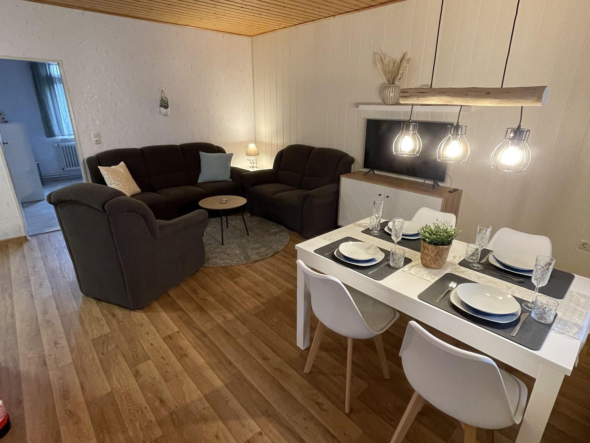 Der große Wohn-, Essbereich ist mit einer hellen Essecke und einem gemütlichen Sofa ausgestattet.