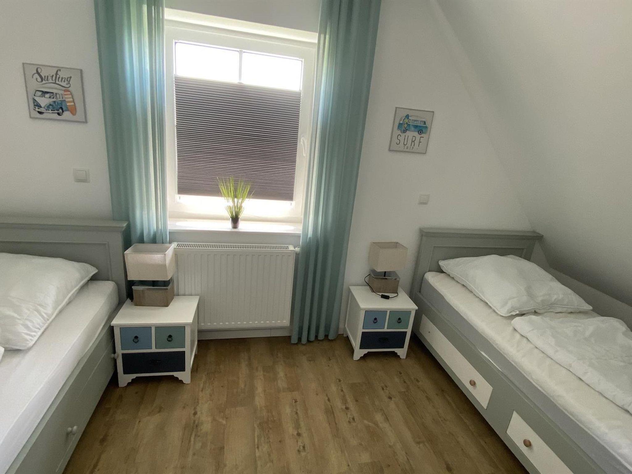 • 3 Schlafzimmer: ein Zimmer zwei Einzelbetten, zwei Zimmer mit einem Doppelbett und Zusatzbett, Bettwäsche auf Wunsch (Fenster mit Plissees)