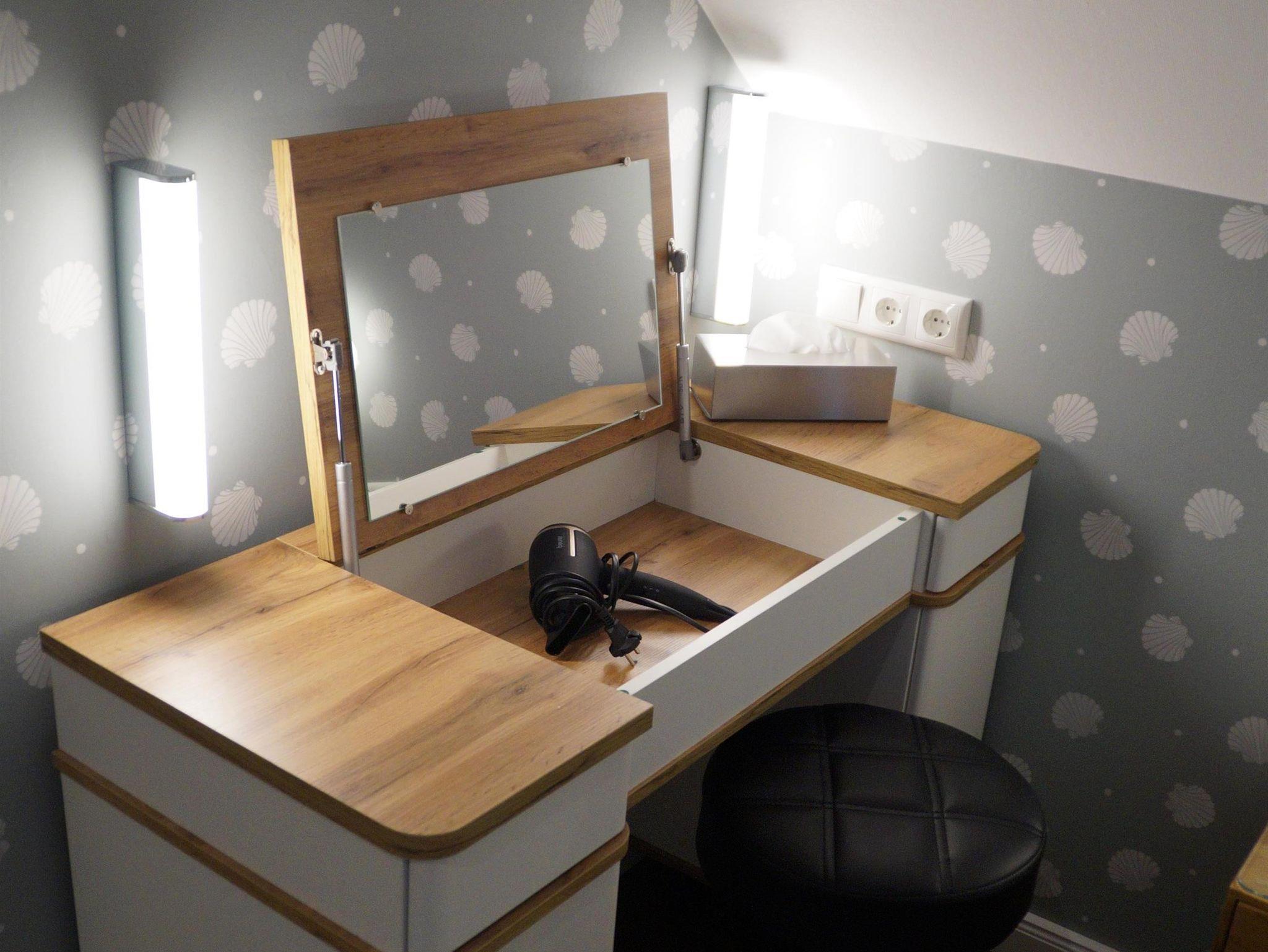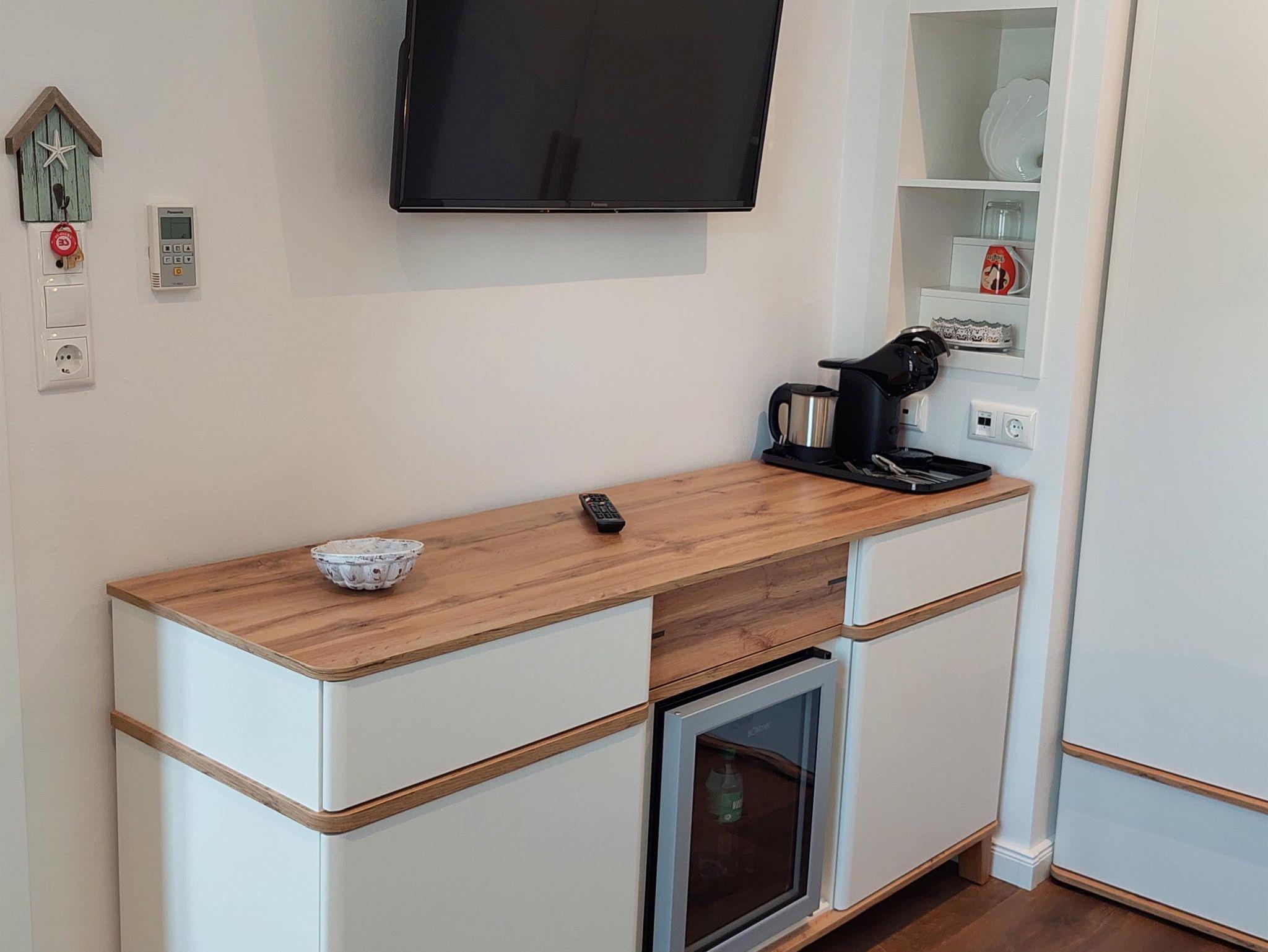 Das Zimmer verfügt über eine Klimaanlage/Heizung, Smart-TV, Kaffeemaschine, Wasserkocher, Föhn, WLAN und einen kleinen Kühlschrank. Zu dem Zimmer gehört eine eigene kleine Badezimmerkabine, wie sie sonst nur auf Kreuzfahrtschiffen zu finden sind.