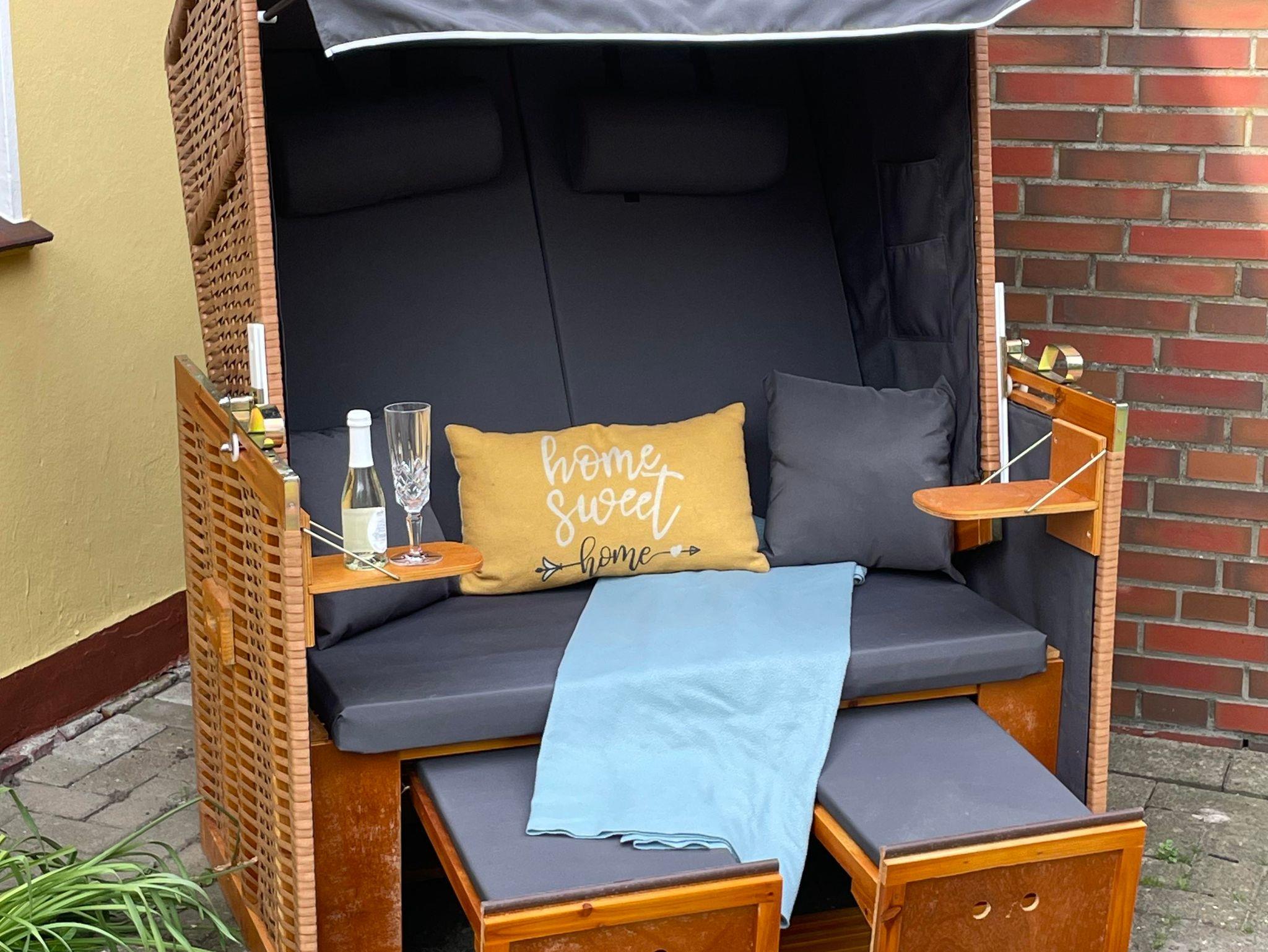 Eine Gemeinschaftsterasse mit Strandkorb lädt zum kennenlernen und verweilen ein. Unsere Wohnung Kajüte hat außerdem eine eigene Terasse mit Sitzecke, Strandkorb und Sonnenschirm.