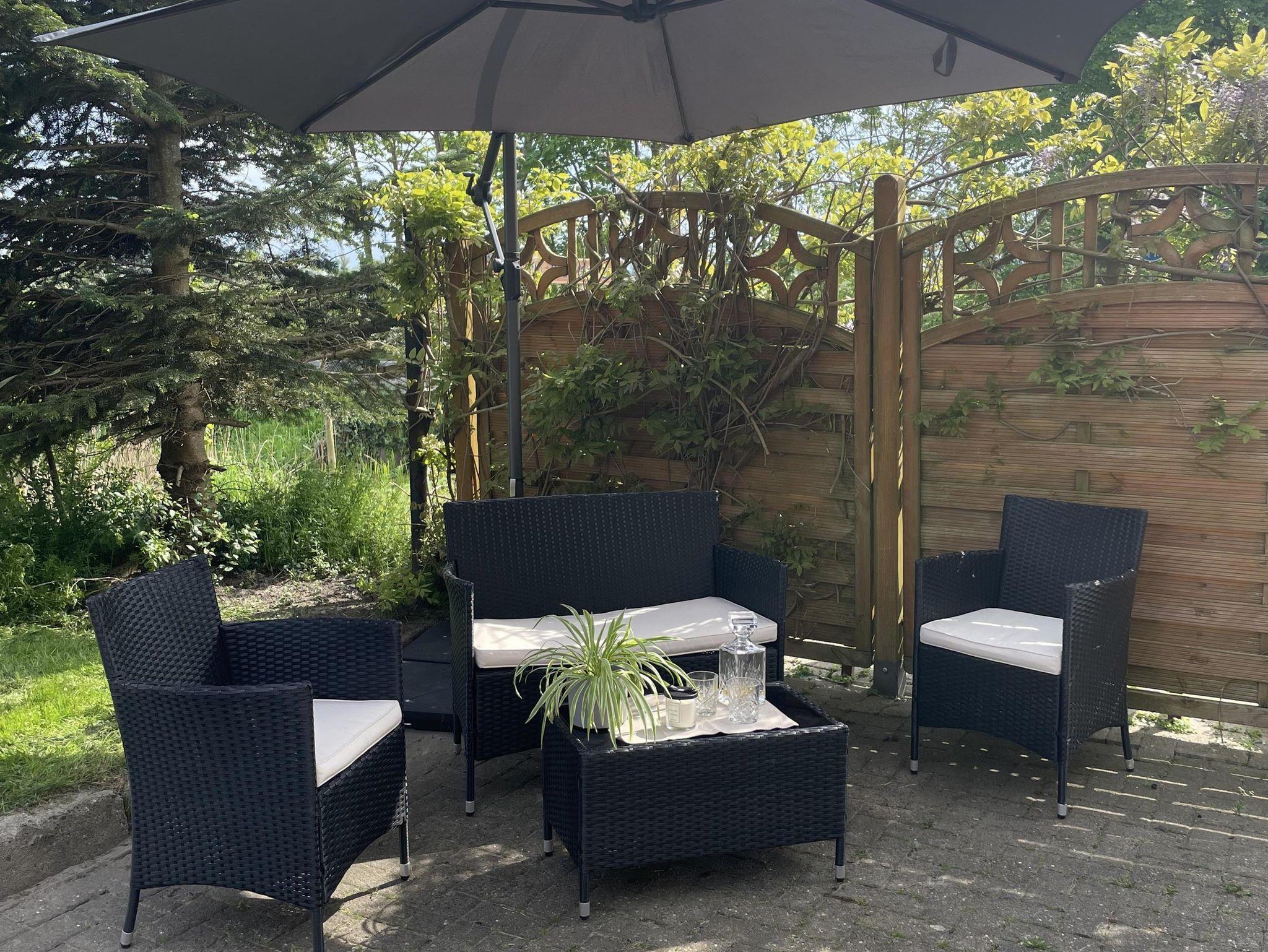 Eine eigene Terrasse mit Strandkorb, Sitzecke und Sonnenschirm bietet einen perfekten Blick über die umliegenden Felder.