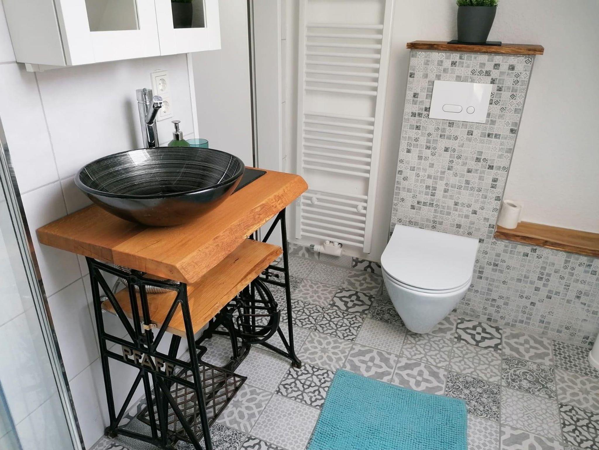 Die ganze Wohnung wurde 2021 kernsaniert, dazu gehört auch das kleine im Vintage-Style eingerichtete Bad.