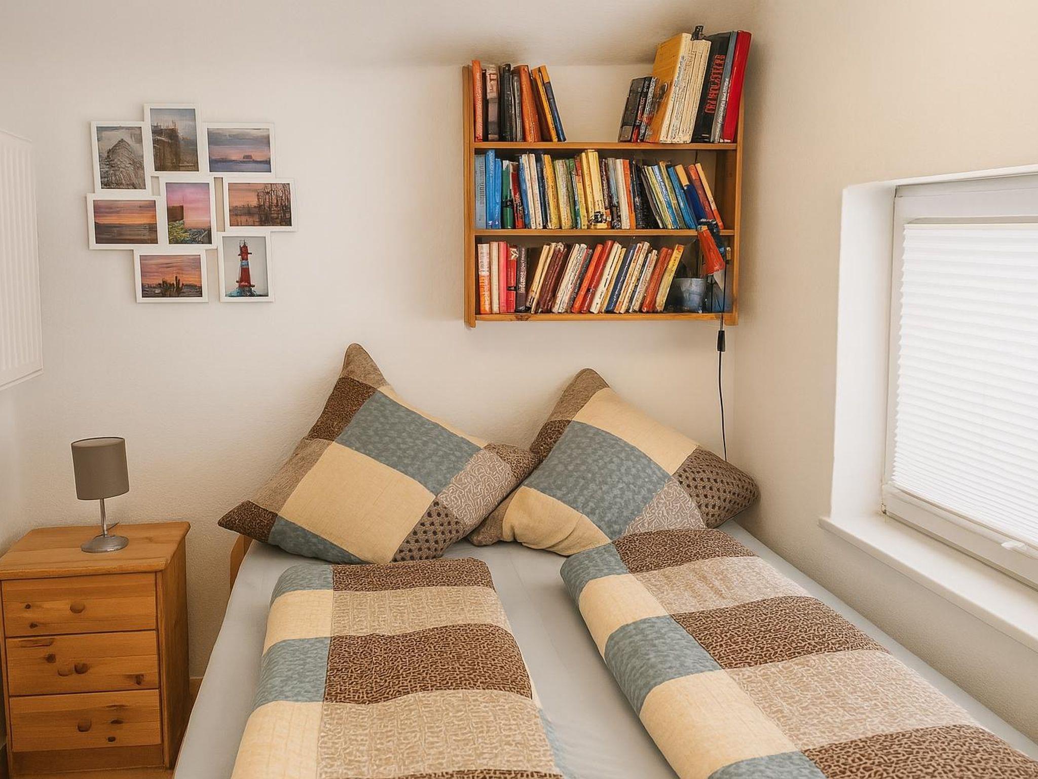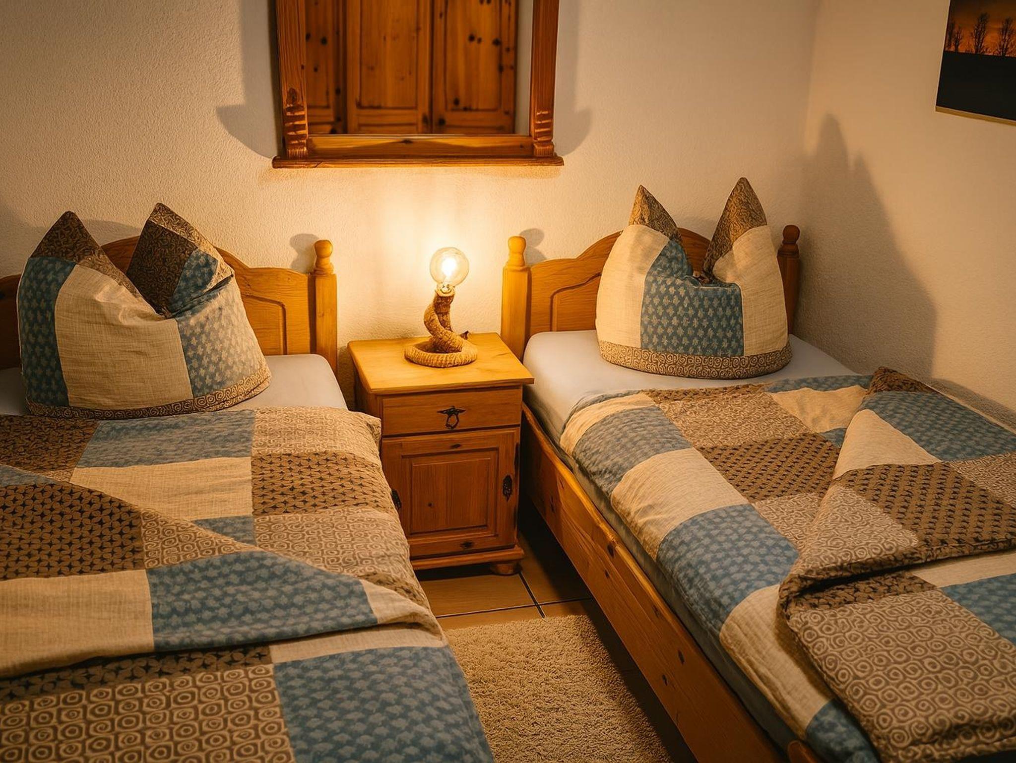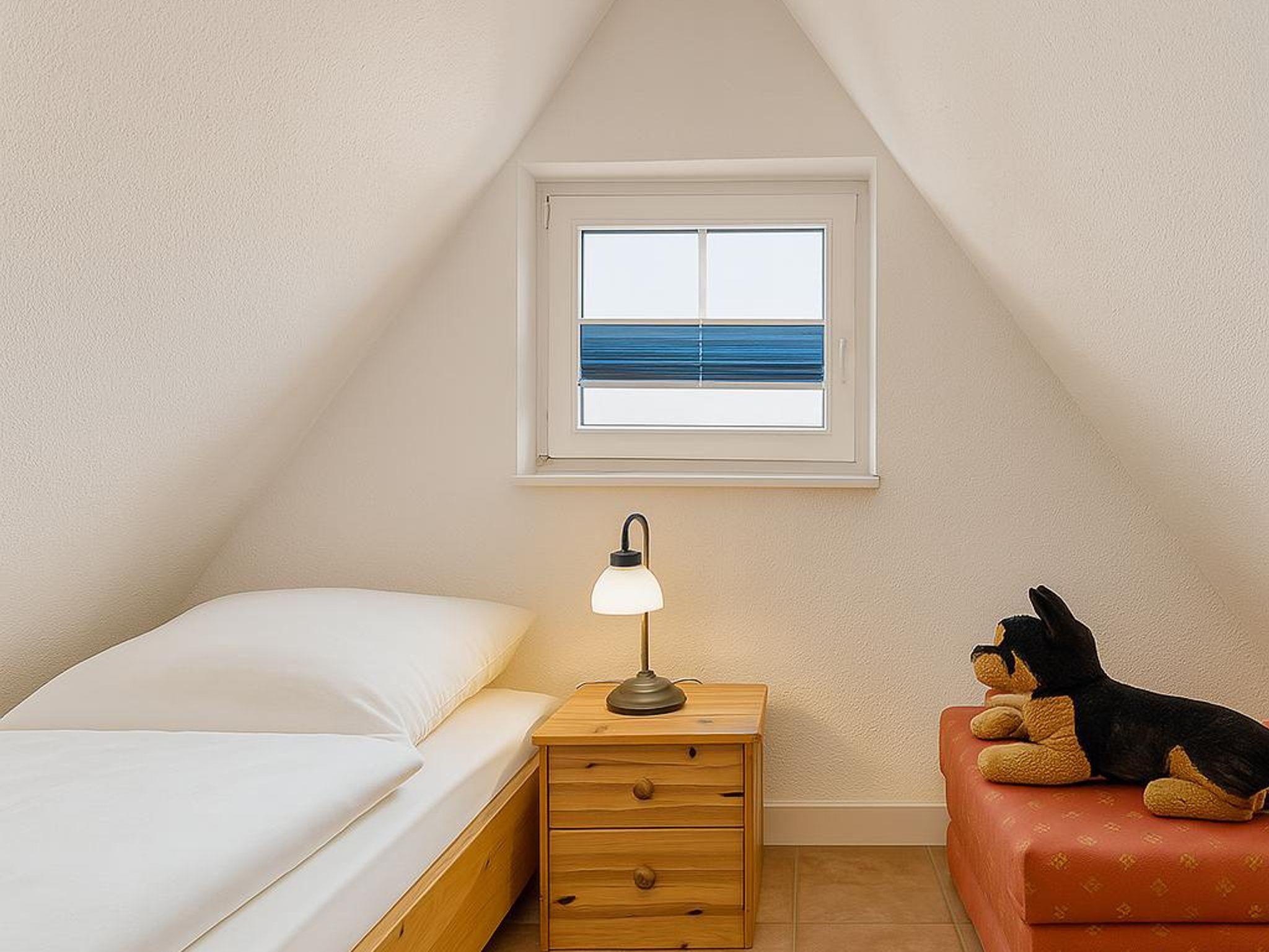 Das Schlafzimmer ist im Obergeschoss untergebracht und bietet Platz für zwei Personen. Es besteht aus zwei Einzelbetten, einem Nachttisch mit Lampe und einem kleinen Bücherregal. Die Dachschrägen lassen das Schlafzimmer besonders gemütlich wirken.