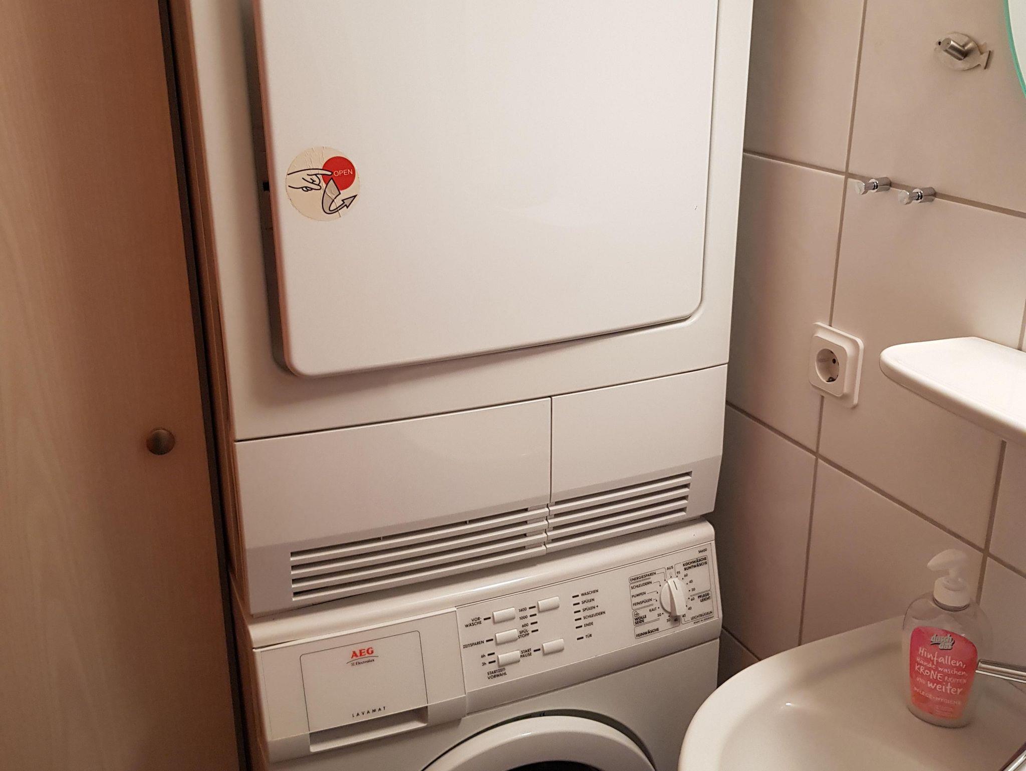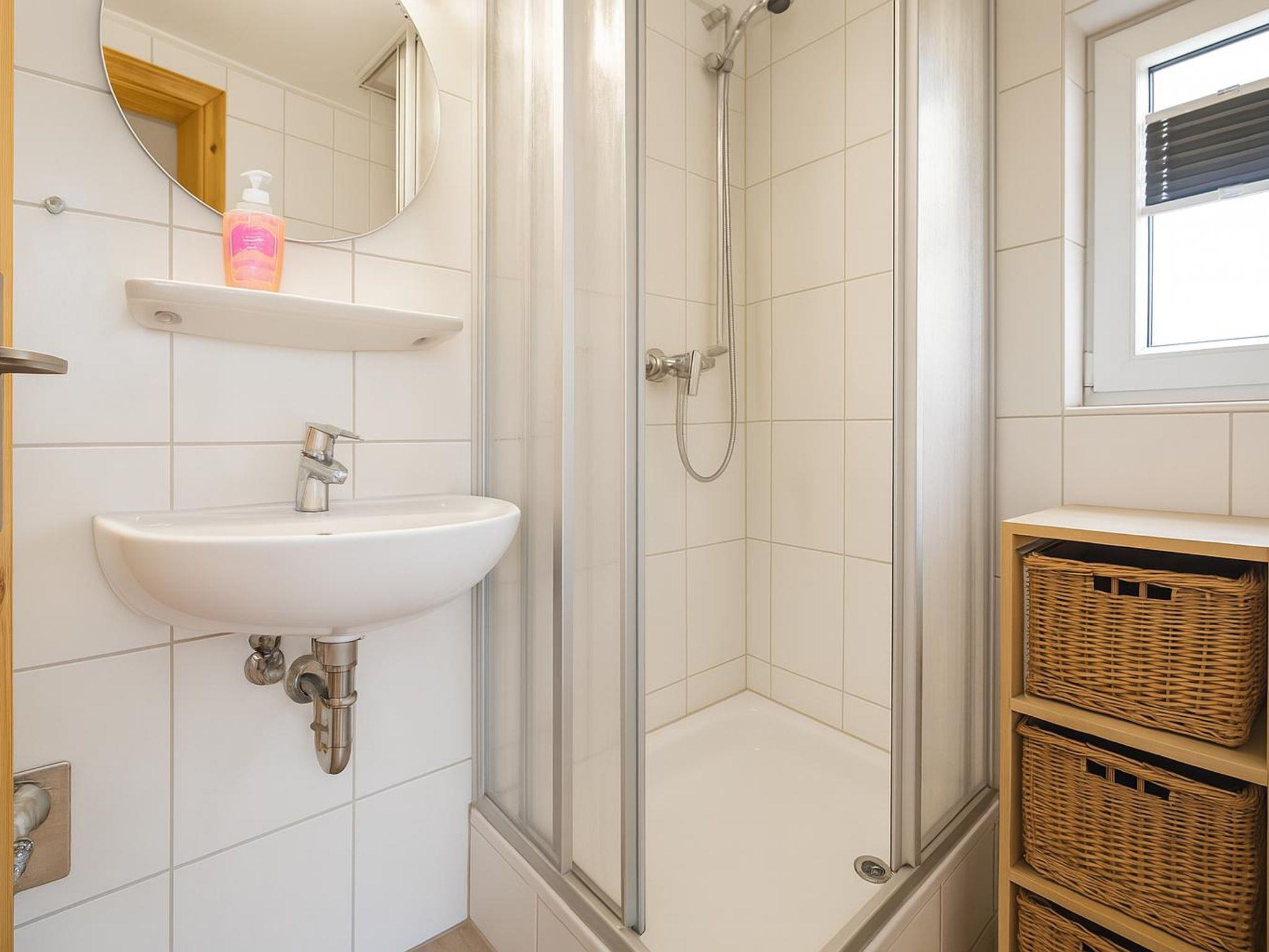 Das Bad verfügt über eine Dusche und ein Waschbecken. Außerdem sind hier Waschmaschine und Trockner untergebracht. Hier befinden sich auch ein Fön und ein Bügeleisen. Das WC ist separat im Nebenraum.