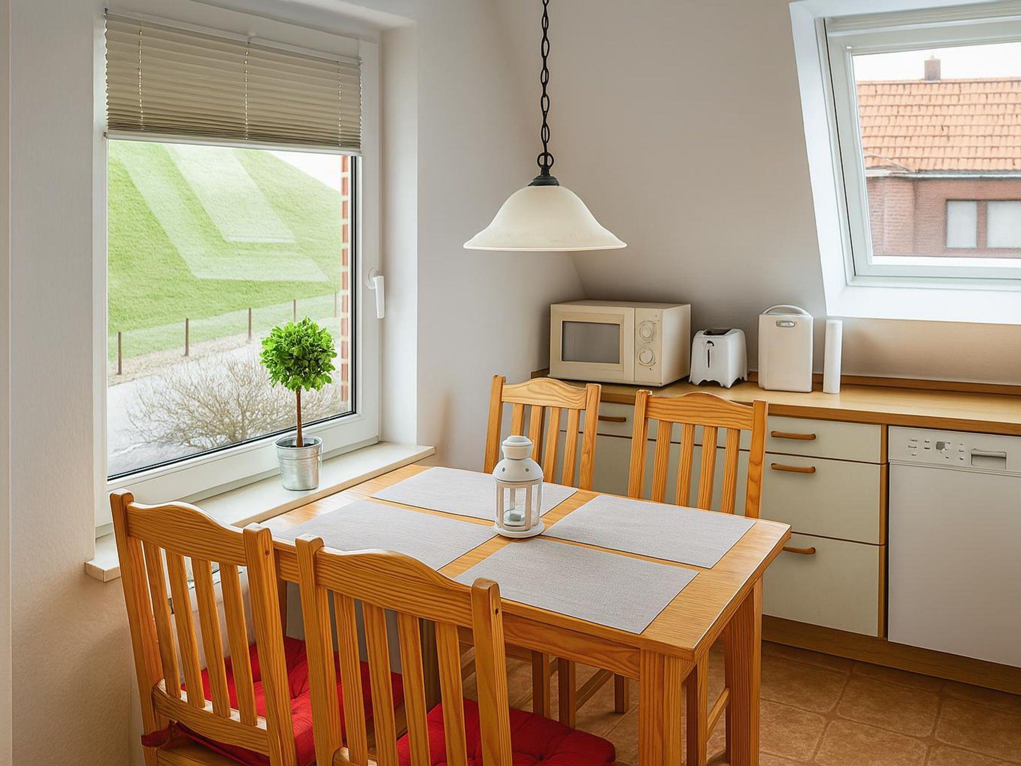Die voll ausgestattete Küchenzeile lässt keine Wünsche offen. Ob Backofen, Herd, Gefrierfach, Kühlschrank oder Spülmaschine...alles vorhanden. Auch die Schränke sind gut gefüllt mit Utensilien vom elektrischen Dosenöffner bis zum Waffeleisen. Eine Grundausstattung von Kaffeefilter bis Salz und Pfeffer ist (wenn nicht vom Vormieter verbraucht) ebenfalls vorhanden. In der sonnigen Essecke kann man in Ruhe seinen Frühstückskaffee genießen.
