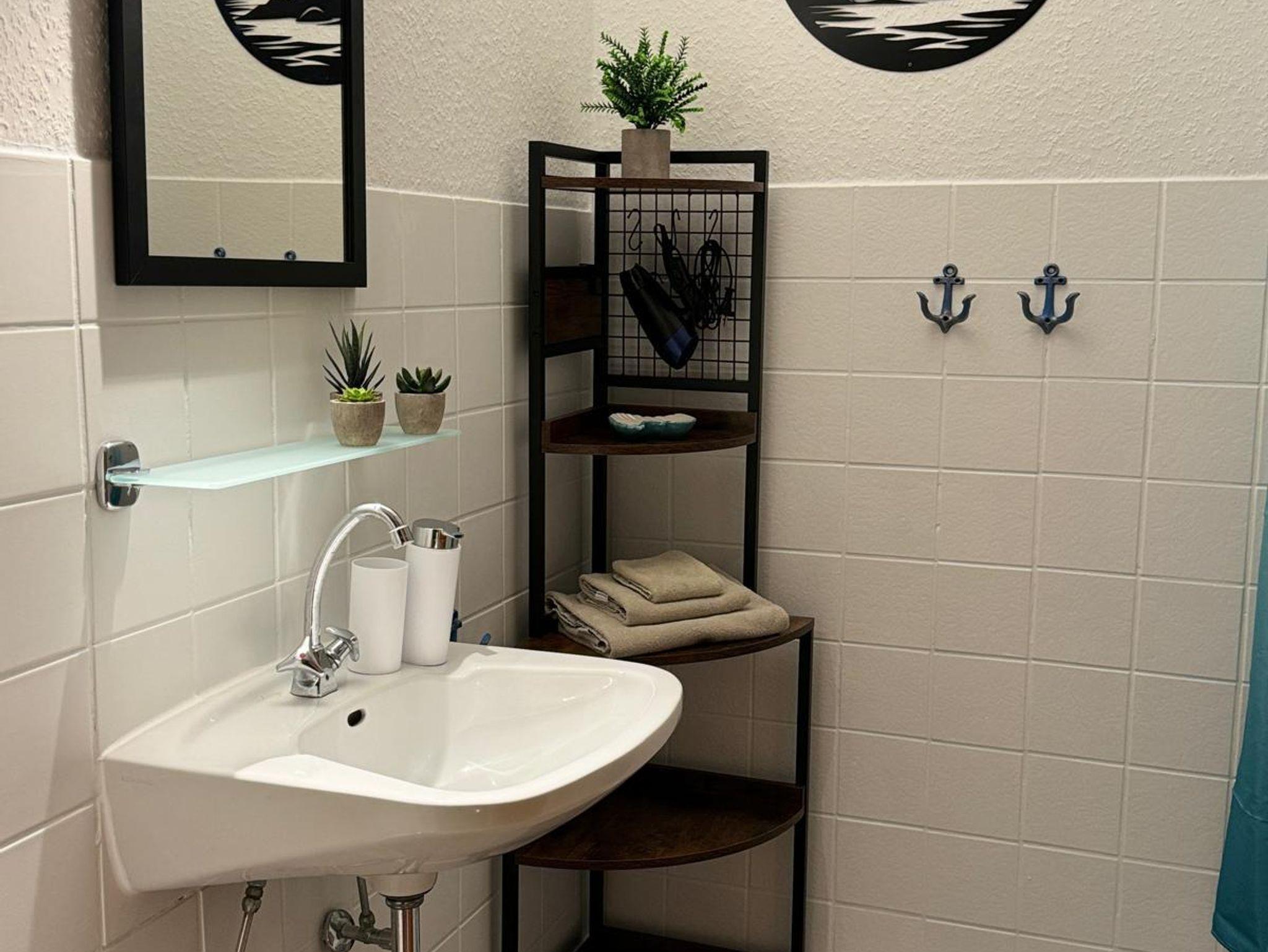 Das Duschbad ist mit einem Waschtisch, Spiegel und einem Föhn ebenfalls voll ausgestattet.