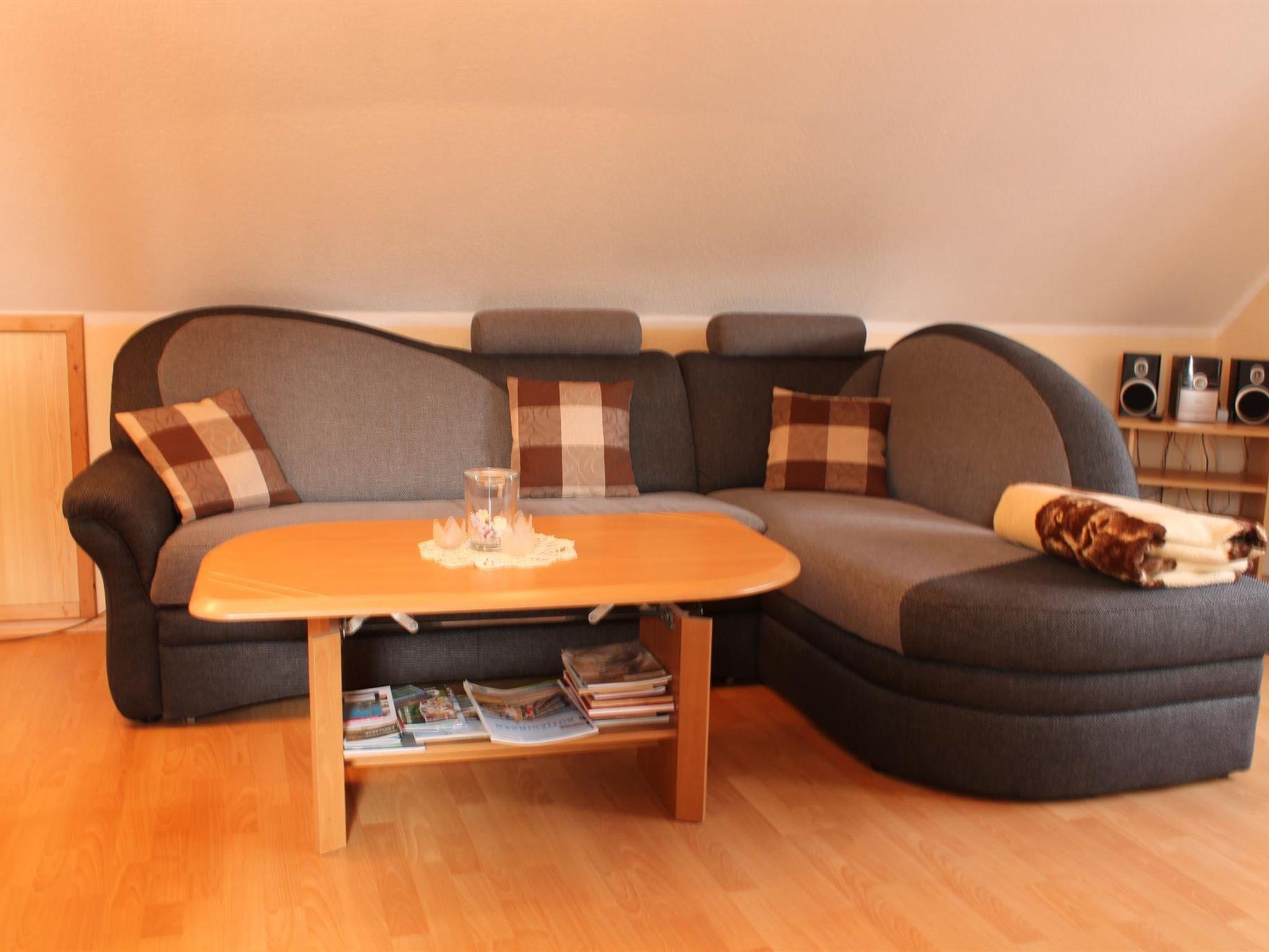 Die Ferienwohnung liegt im Obergeschoß und hat eine großzügige Wohnküche mit einer gemütlichen Couch, TV und Radio / CD und einem Esstisch.In der Küche finden Sie einen Backofen, Mikrowelle, Kaffeemaschine, Wasserkocher, Toaster.