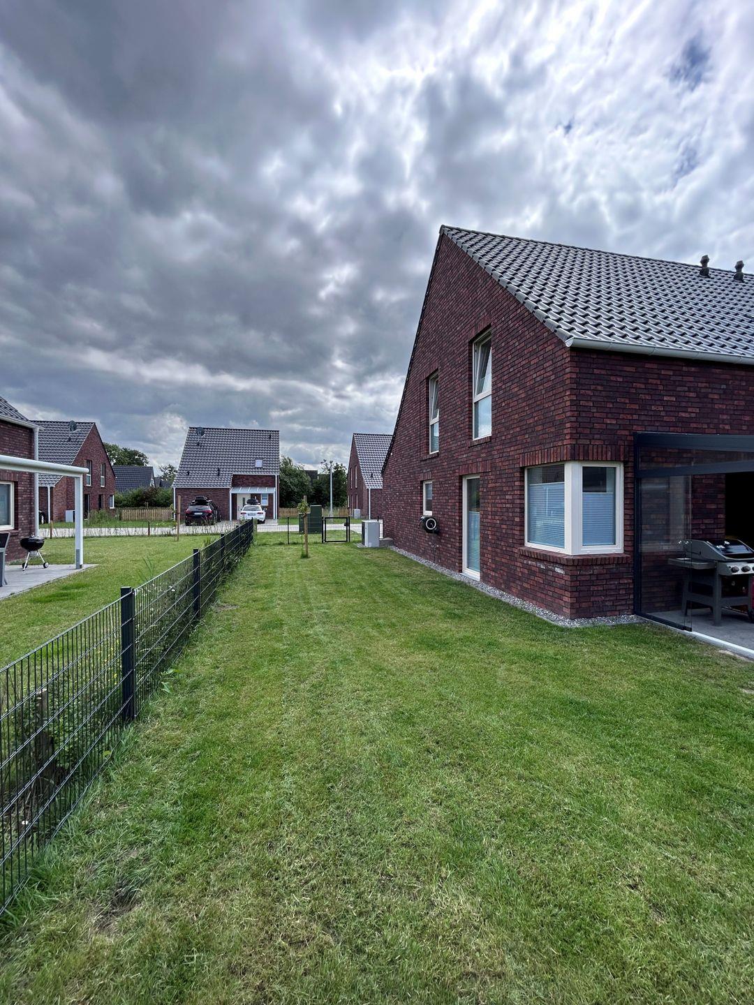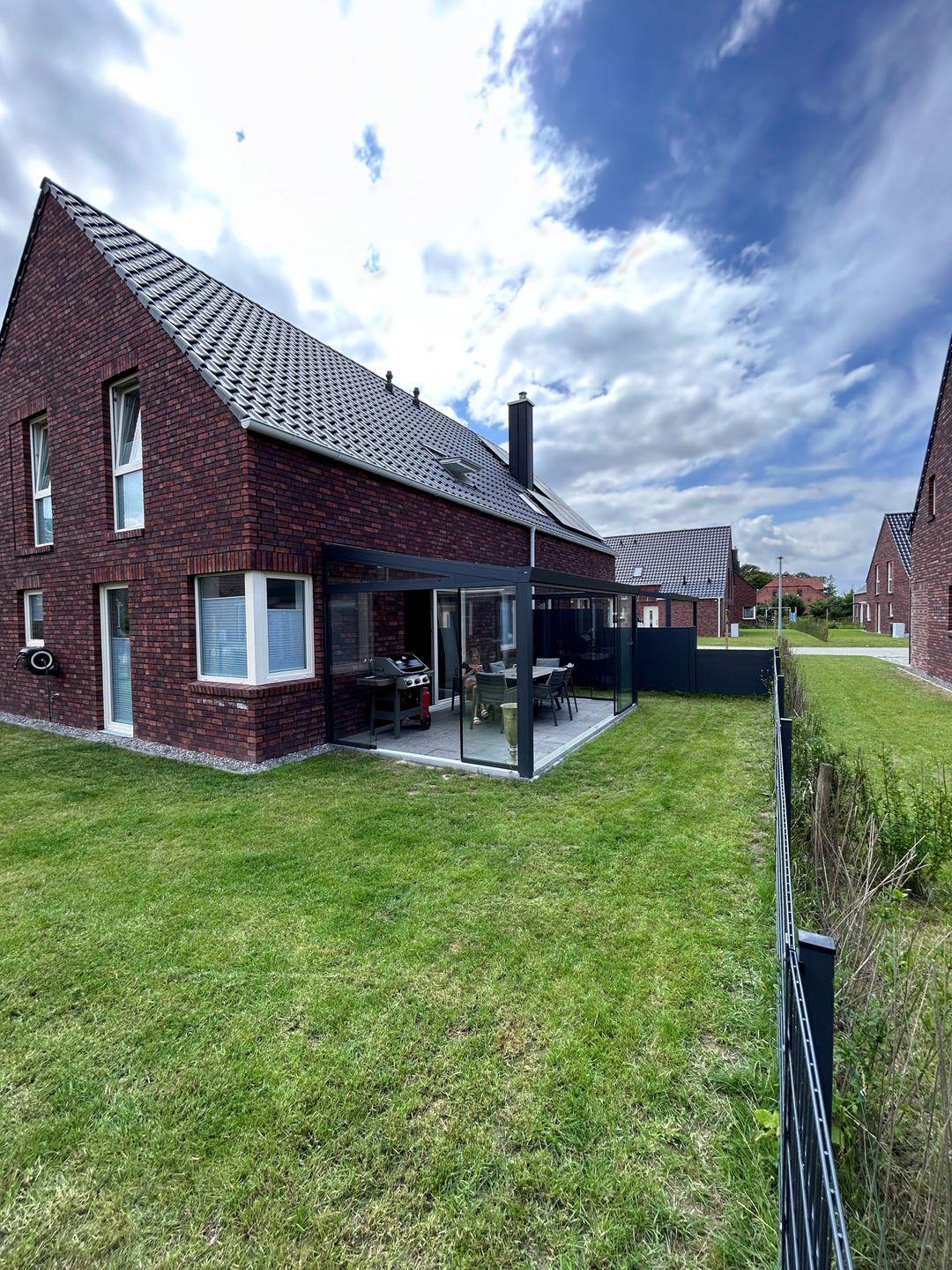 Im eigenen Garten, der komplett eingezäunt ist, finden wir dann neben einem tollen Kinderspielturm das eigentliche Highlight: Eine traumhafte Terrassenüberdachung mit Schiebetüren, Sonnenschutz und einem ausziehbaren Tisch mit 8 Stühlen.