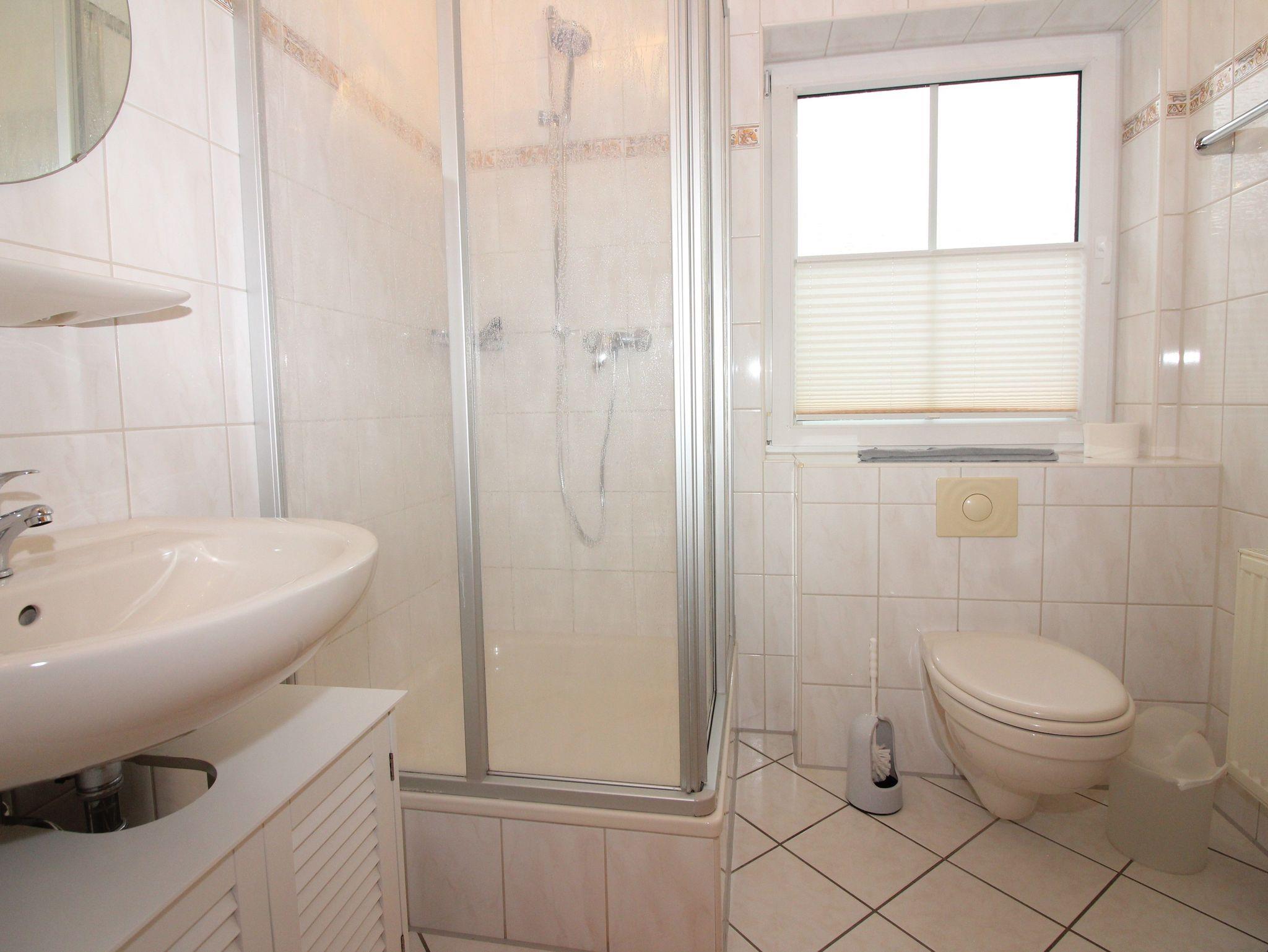 Das im Erdgeschoß liegende Badezimmer ist mit einer ebenerdigen Dusche und mit breiter Glastür ausgestattet.