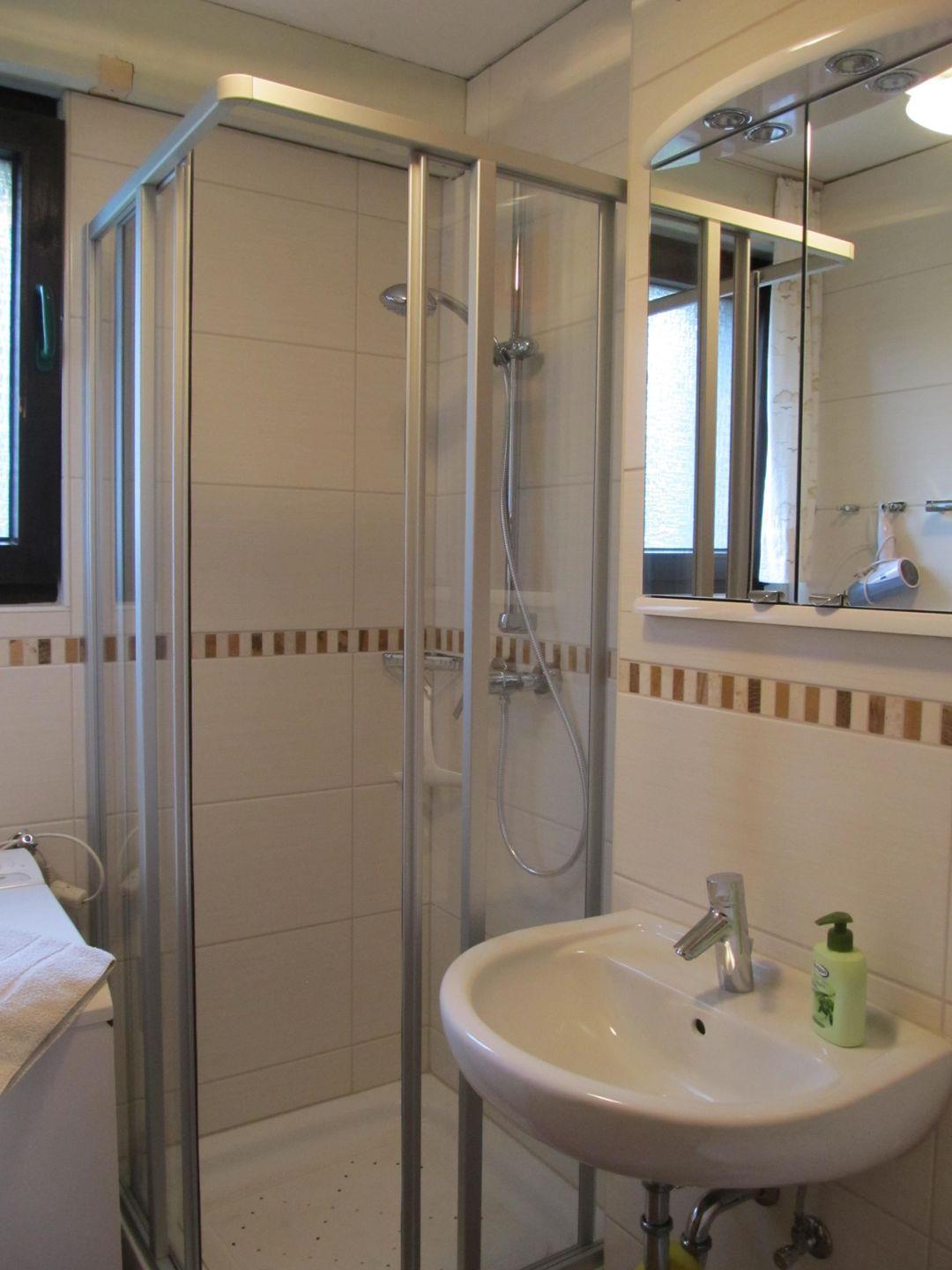 - Ein Duschbad mit WC, Waschbecken und Waschmaschine.