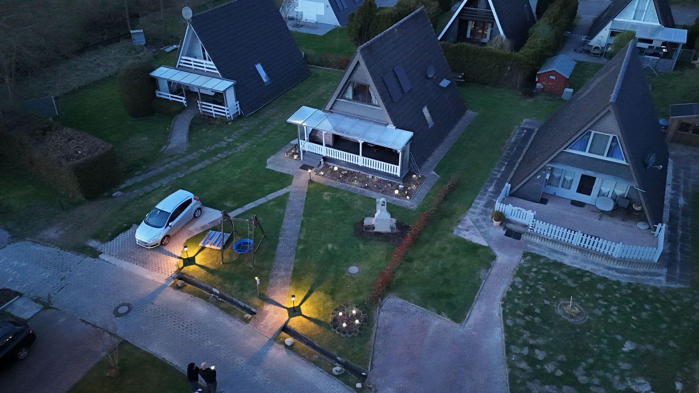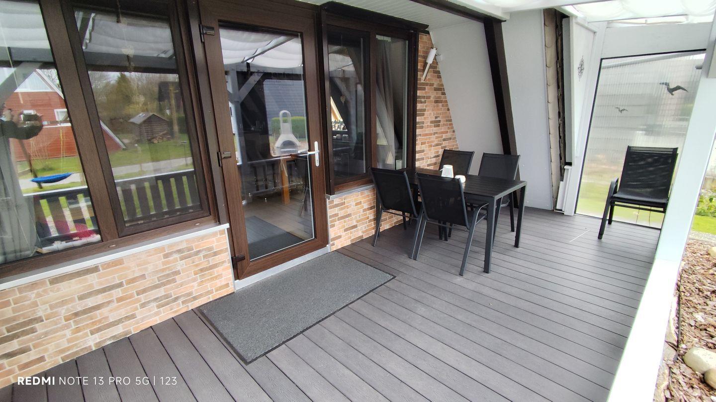 Außerdem gibt es eine eingezäunte überdachte Terrasse mit Sitzmöglichkeit, ein Rasengrundstück mit Grillplatz, eine Nestschaukel und einen Sandkasten.