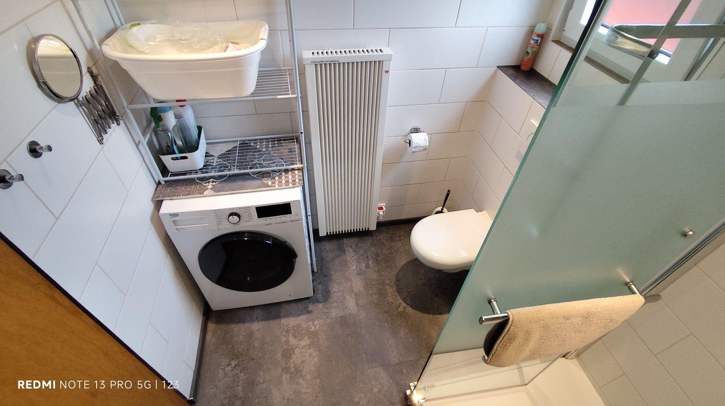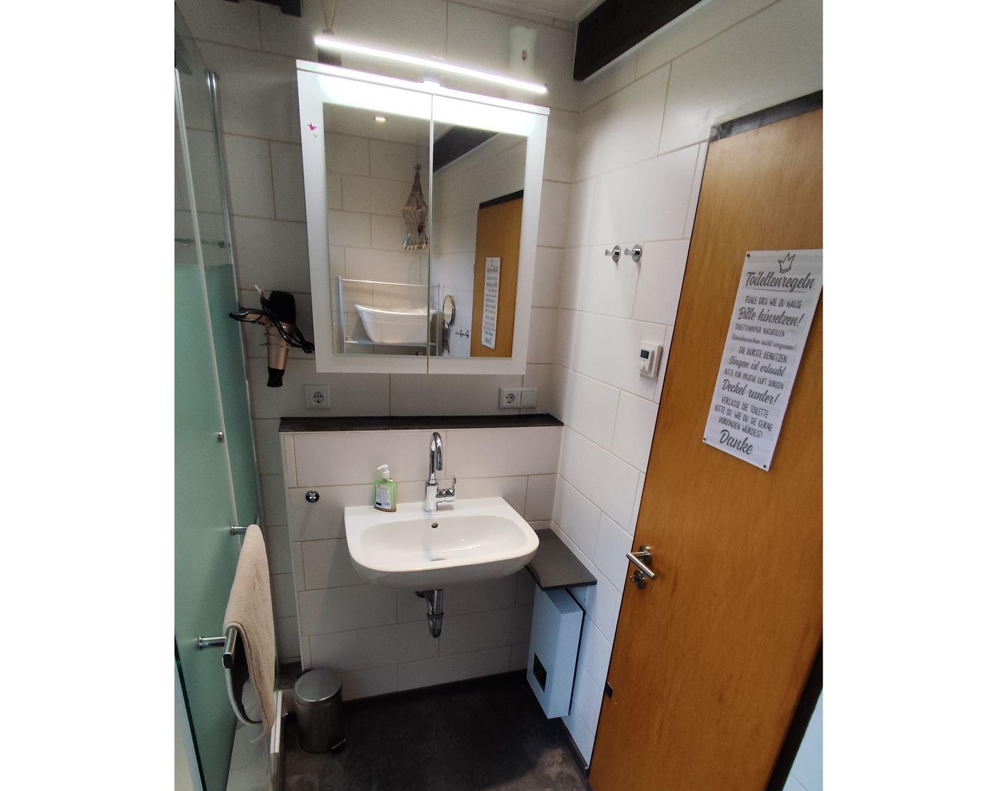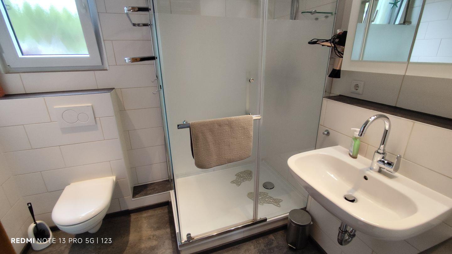 Das Badezimmer bietet eine große Dusche ( 120x90 cm ), WC, Waschtisch mit Spiegel, Föhn, Waschtrockner, sowie diverse Ablagemöglichkeiten.