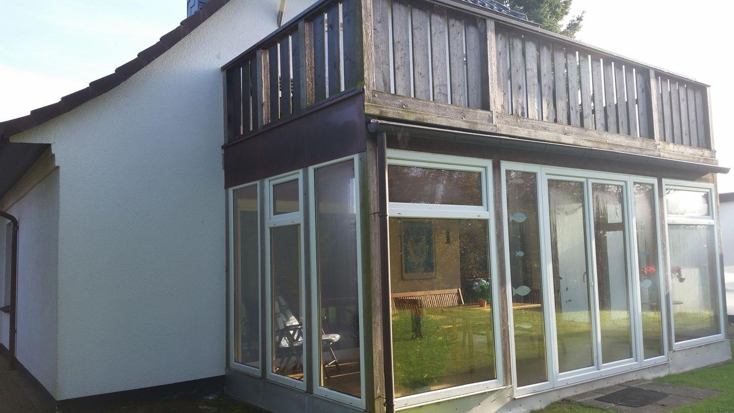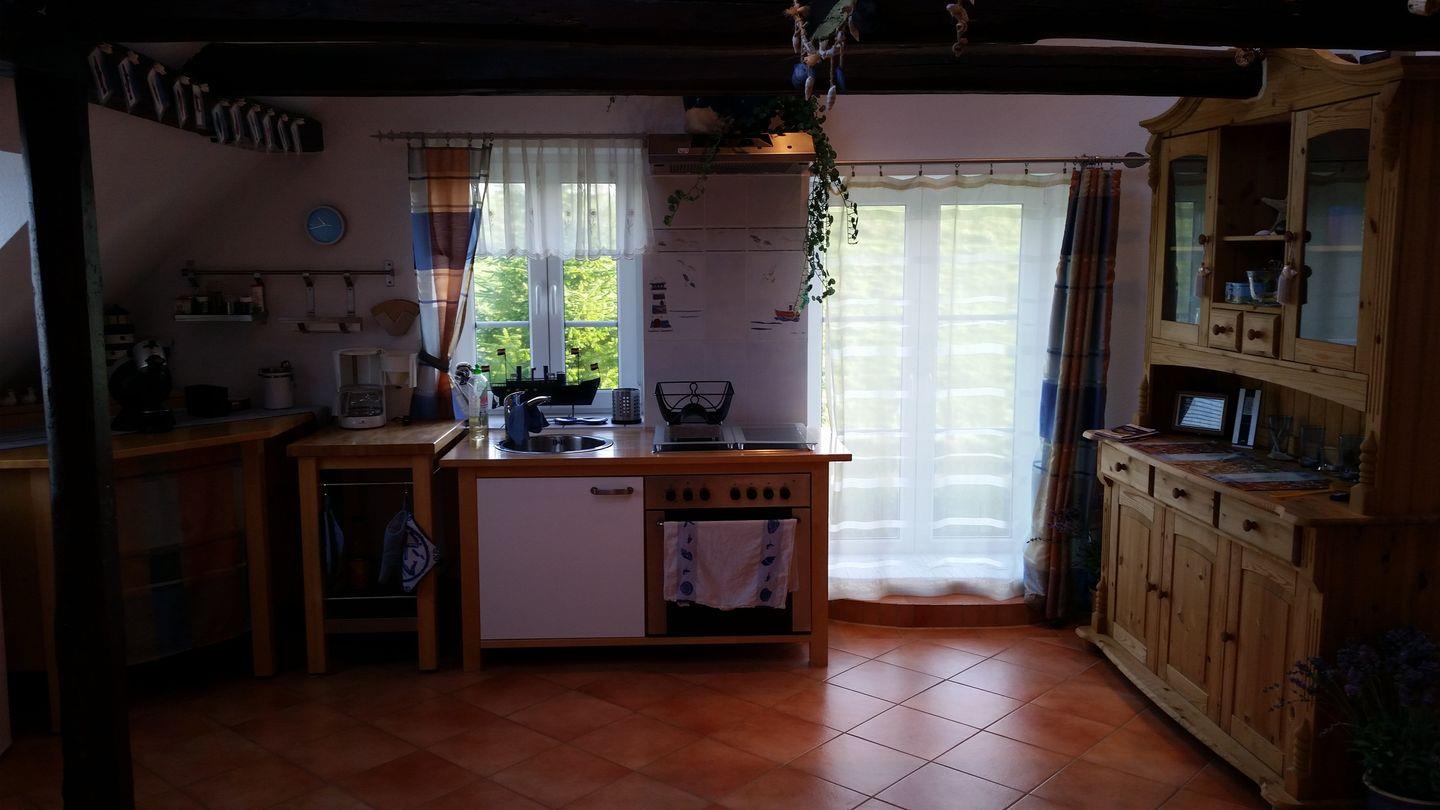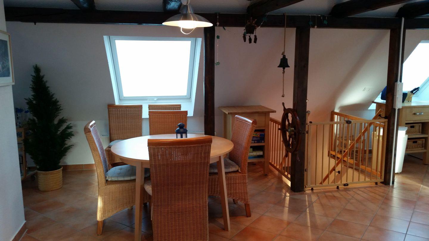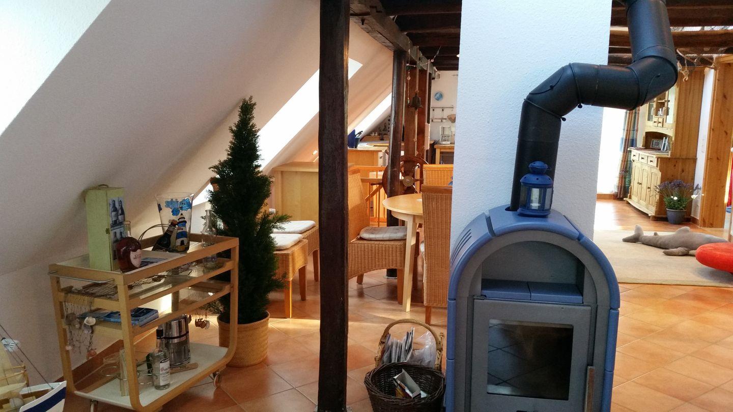 Die Wohnung ist für bis zu 2 Personen (auf Anfrage auch mit 1 Hund) geeignet. Der Treppenaufgang, der mit einer Kinder-Sicherheitstür ausgestattet ist, endet in den mehr als großzügigen Wohn- ,Ess- und Kochbereich. Damit ist das Wohn- und Esszimmer der zentrale Treffpunkt in der Ferienwohnung und bietet allen Komfort, den Sie erwarten können. Eine gemütliche Couchecke garantiert entspannte Stunden vor dem Kaminofen und/oder bei einem (hoffentlich) interessanten Fernsehprogramm. Oder Sie entspannen bei einem spannenden Buch? Der Essbereich mit einem großzügigen Esstisch und entsprechend bequemen Stühlen befindet sich in unmittelbarer Nähe zur Kochecke. Ein Kühlschrank mit Gefrierfach, ein Ceranherd mit Backofen und vollständiges Geschirr und Besteck lässt wirklich keinen Wunsch offen. Kaffeemaschine, Wasserkocher, usw. runden das Angebot komplett ab! Und zur Ruhe und Erholung lädt auch der großzügige und von den Nachbarn nicht einsehbare Balkon ein, den Sie sowohl über das Wohnzimmer als auch über das Schlafzimmer erreichen können. Diese Ferienwohnung kann man wirklich als absolut gehobene Ausstattung am besten beschreiben.
