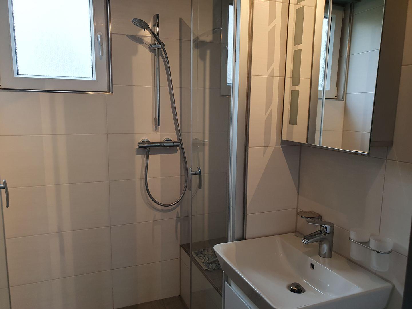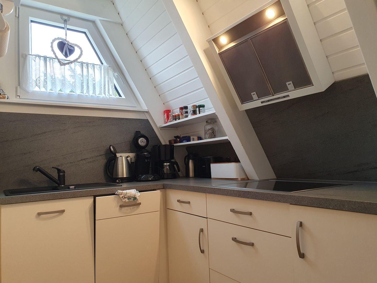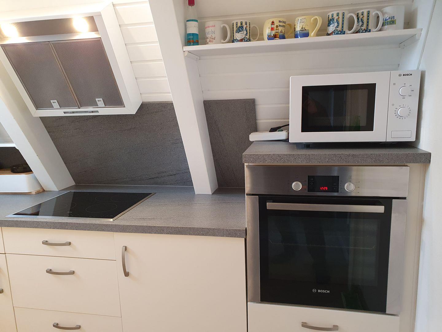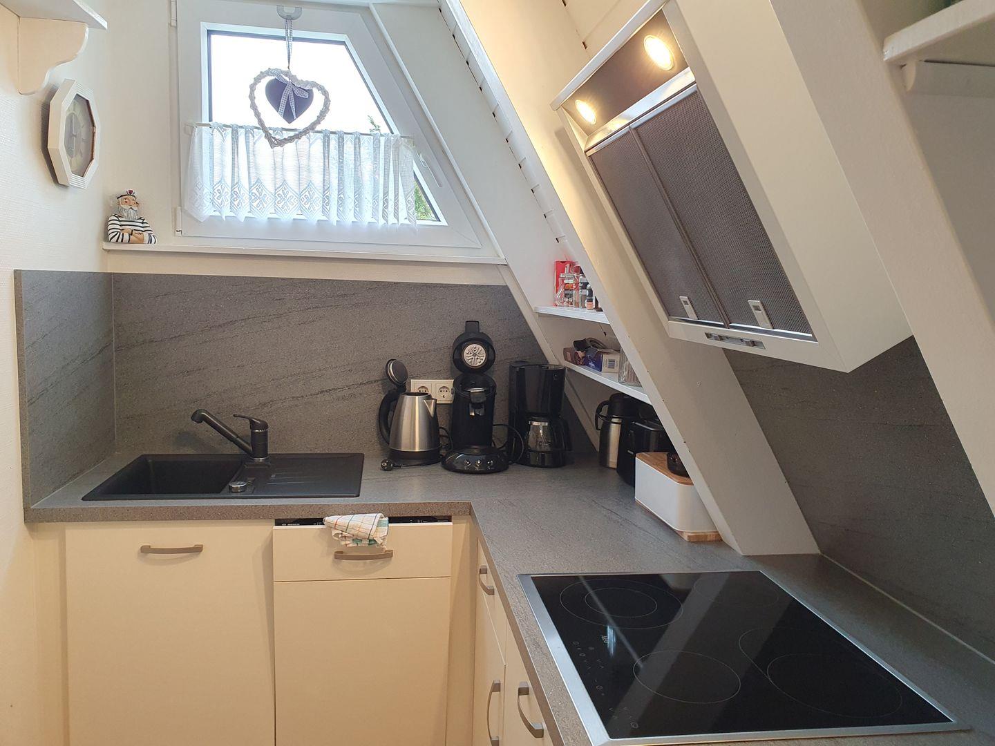 Im Erdgeschoss befindet sich eine komplett eingerichtete Einbauküche u.a. mit Cerankochfeld, Backofen und Spülmaschine, das Wohn-, Esszimmer sowie ein Duschbad.