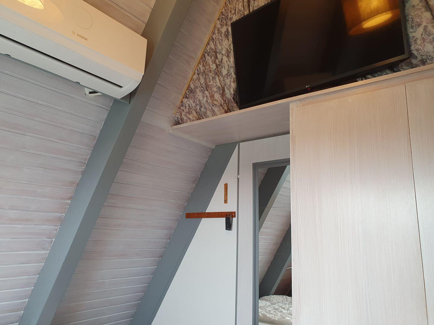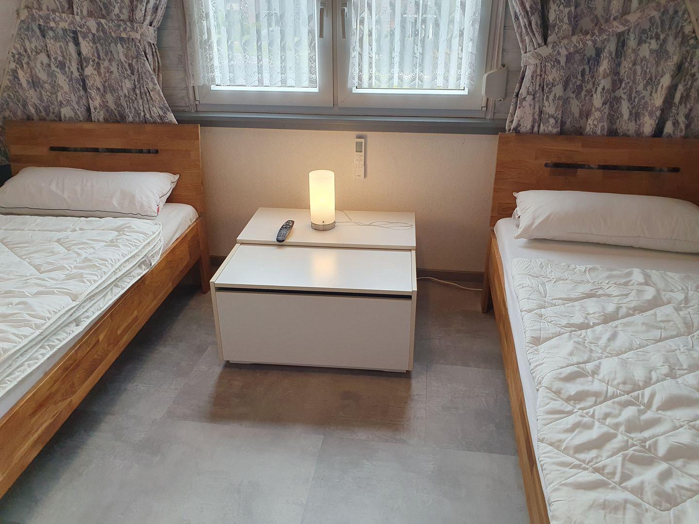 Im Obergeschoss sind 2 Schlafräume: Eines mit einem Doppelbett und das andere mit 2 Einzelbetten. Jedes Schlafzimmer verfügt über eine Klimaanlage.
