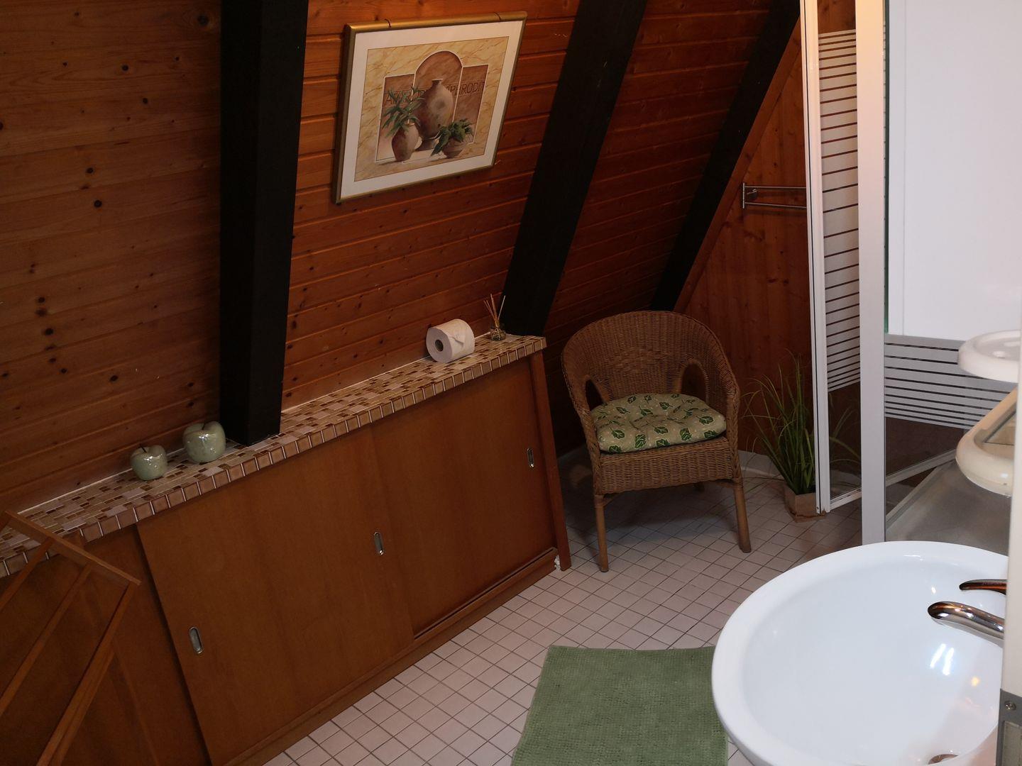 Das Tageslichtbad bietet eine Dusche, einen Waschtisch und das WC.