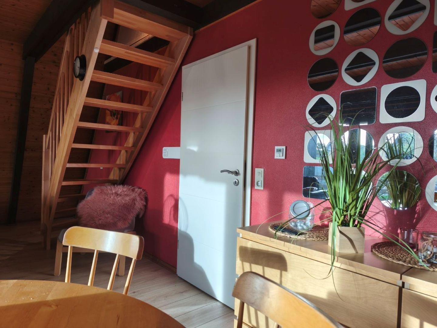 Die Treppe ins Obergeschoss ist eine normale Treppe (keine Raumspartreppe).