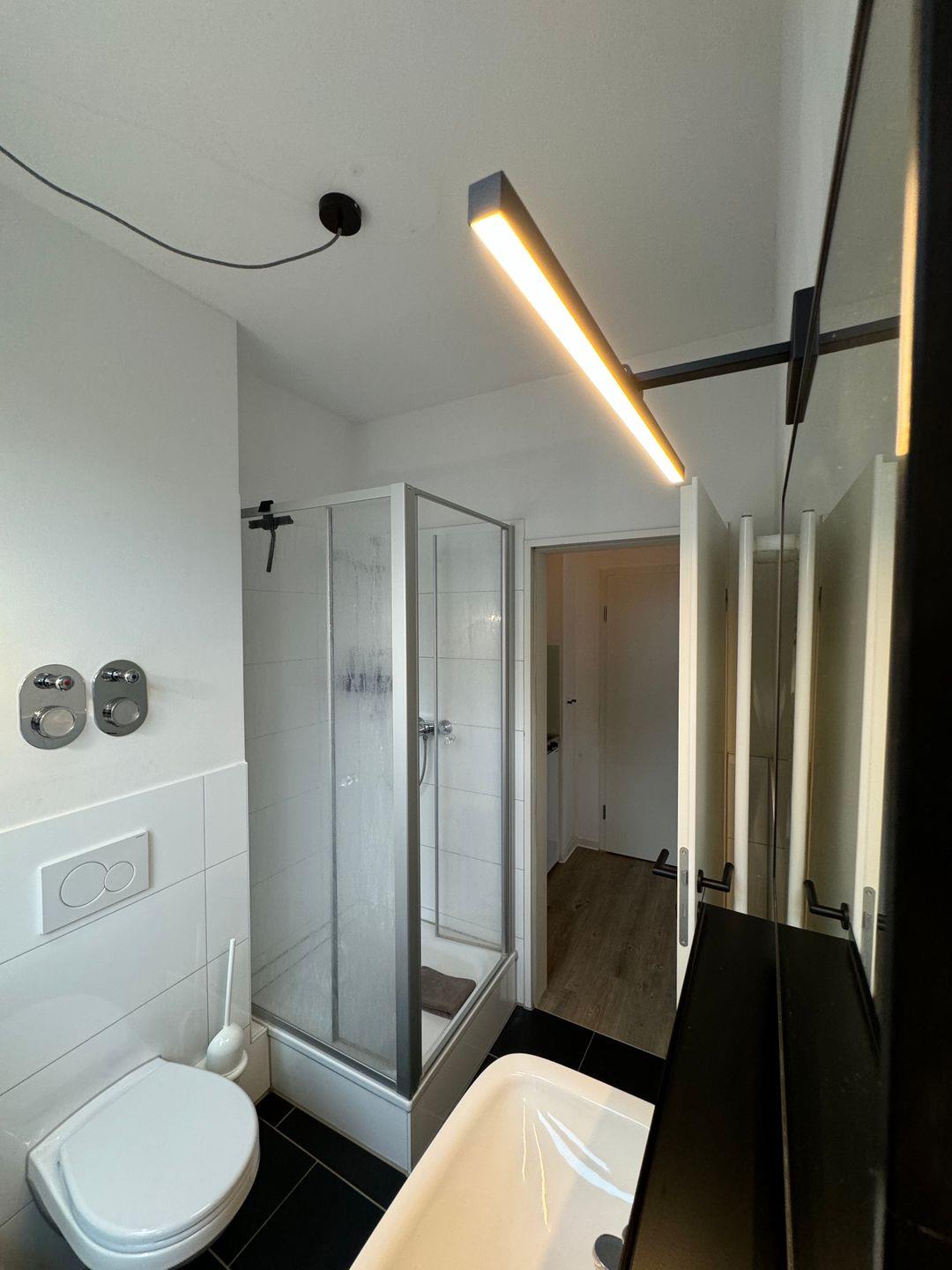 Das moderne Badezimmer mit Dusche hat eine Handtuchheizung und ausreichend Ablagemöglichkeiten für deine persönlichen Kosmetikprodukte. Handtücher, einen Haartrockner und Körperpflegeprodukte bekommst du von uns gestellt.